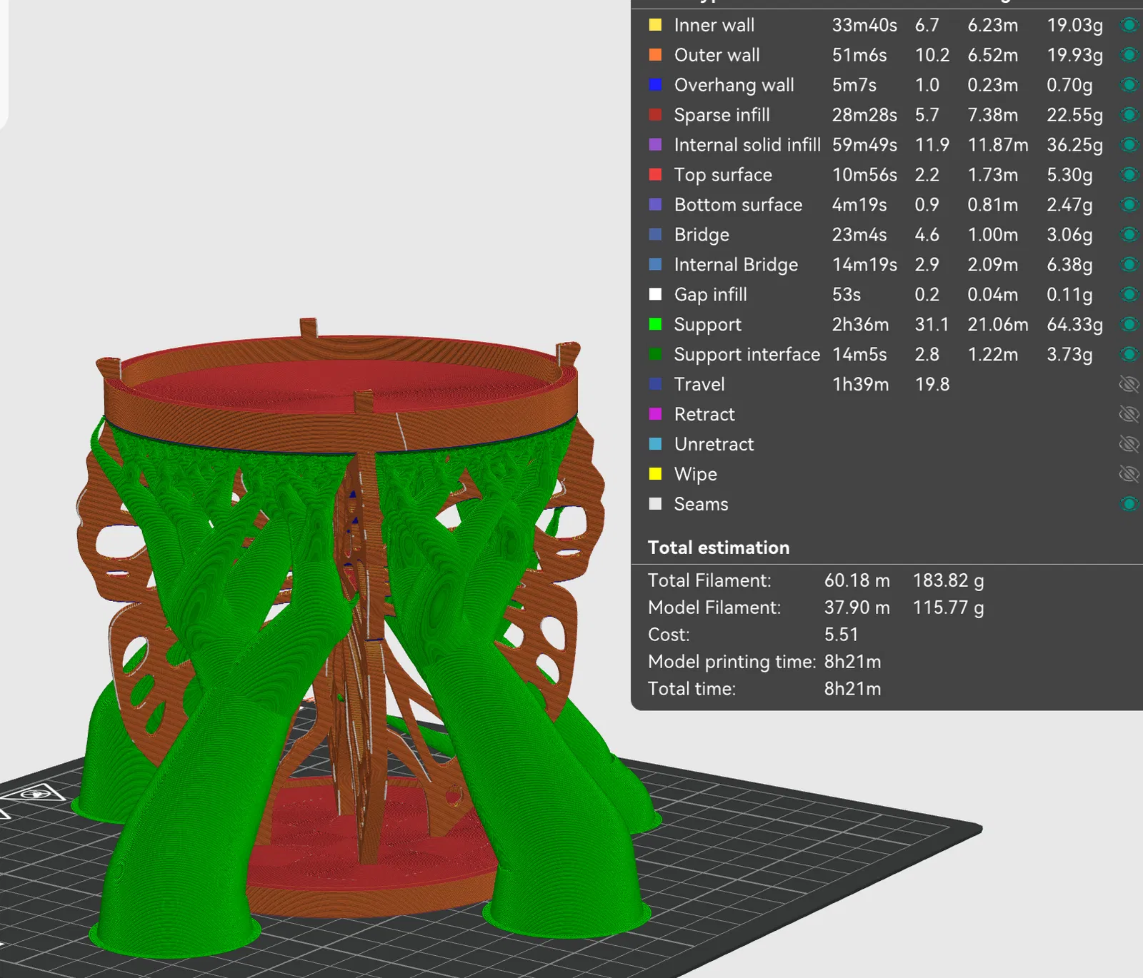 Mình thiết kế mẫu đế nến này cho vợ mình để đựng mấy hũ nến Bath and Body của cô ấy. Mình khuyên các bạn nên in bằng nhựa PETG nha, vì phần đáy đế có thể sẽ bị nóng khi đốt nến. Để việc hậu kỳ dễ dàng hơn, mình gợi ý nên dùng tree support, chỉ hỗ trợ những vùng quan trọng và đặt trên bàn in thôi nhé. Các thông số cài đặt cụ thể nè: