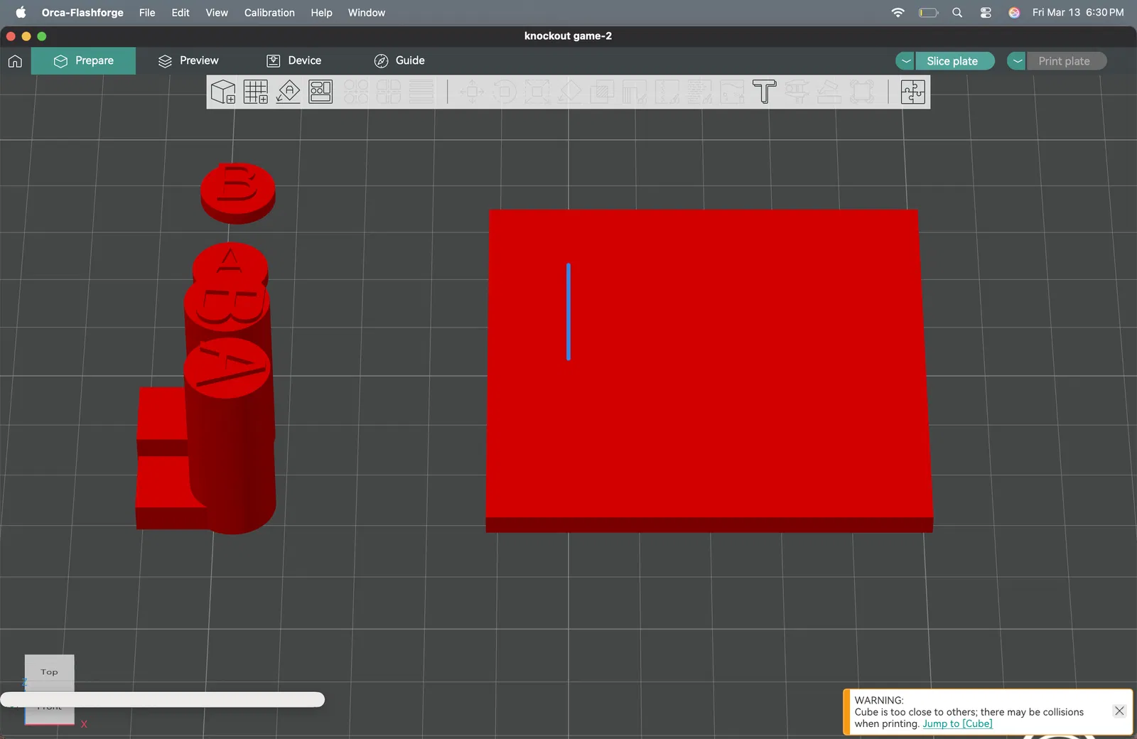 - Lưu ý khi in: Hãy sắp xếp các chi tiết trên bàn in (build plate) sao cho không quá sát nhau để tránh va chạm đầu phun, như cảnh báo từ phần mềm slicer.