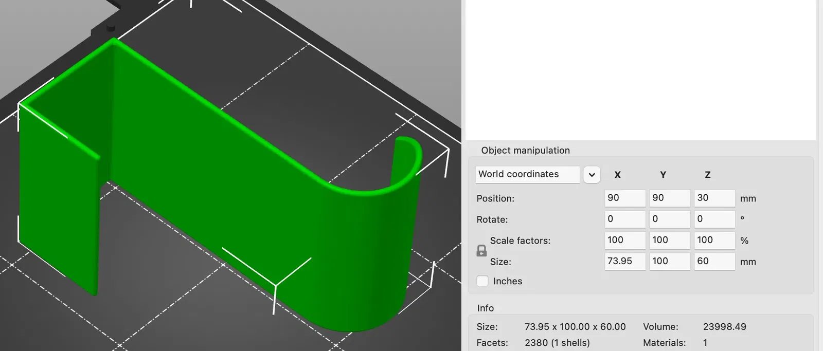 Bởi vì nó chỉ dày 2 mm, mô hình rộng 60 mm để tăng cường độ bền. Do độ rộng của nó, móc này có lẽ sẽ không phù hợp với một móc treo quần áo thông thường.