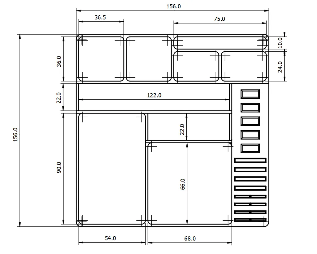 Nó có kích thước 156 x 156 x 80 mm, cho kích thước từng ngăn, tôi đã chèn một bức tranh với các kích thước.