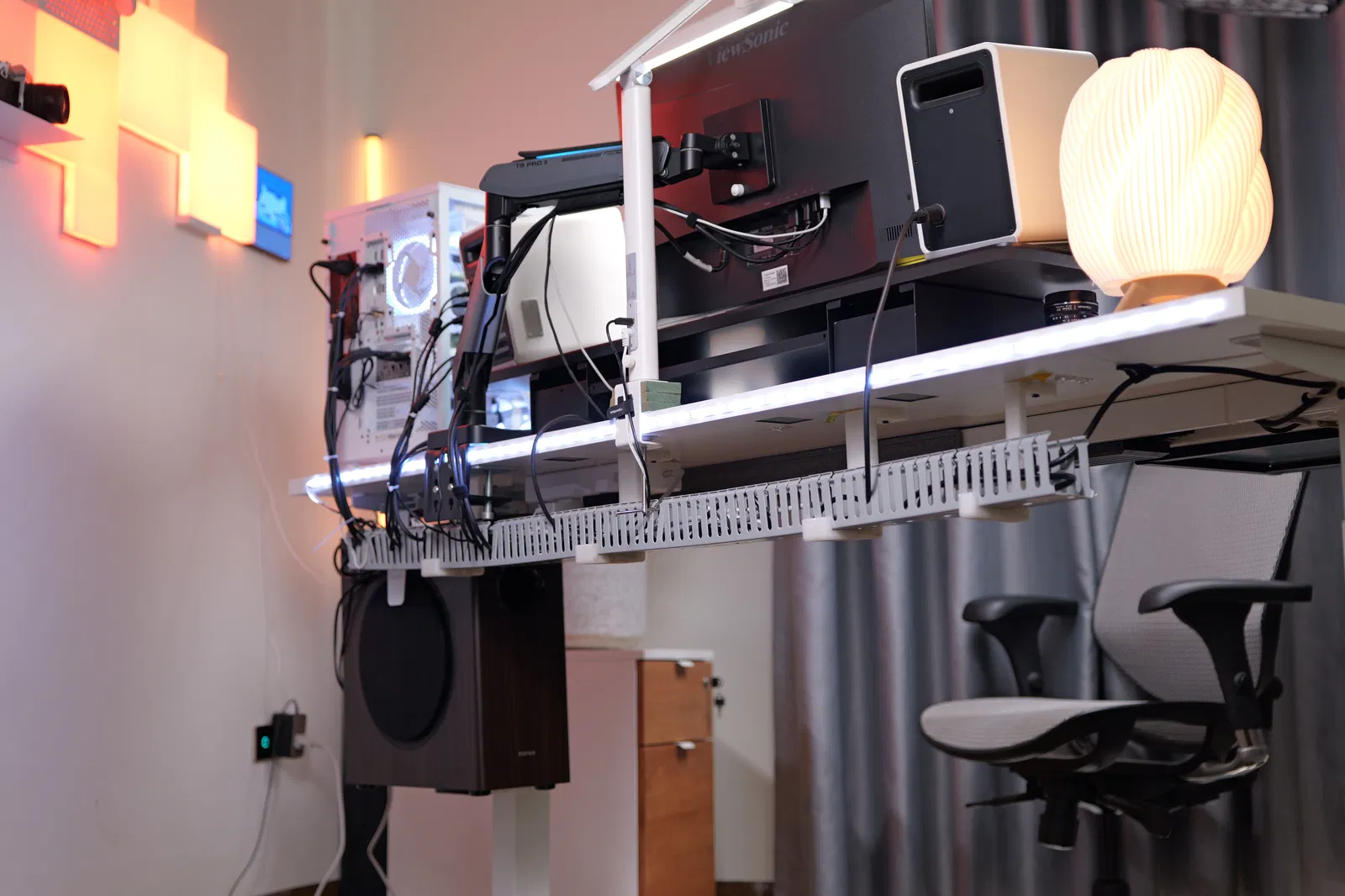 Thiết kế này được tối ưu hóa để kết hợp cùng các loại máng cáp chuyên dụng, giúp giữ cho dây dẫn không bị buông thõng hay gây vướng víu khi bạn di chuyển hoặc ngồi làm việc. Việc lắp đặt cũng rất trực quan và linh hoạt, cho phép bạn tùy chỉnh vị trí các khay đỡ tùy theo độ dày và cấu trúc mặt bàn hiện có của mình. Đây chắc chắn là món đồ không thể thiếu cho những ai yêu thích setup bàn làm việc tối giản và chuyên nghiệp.