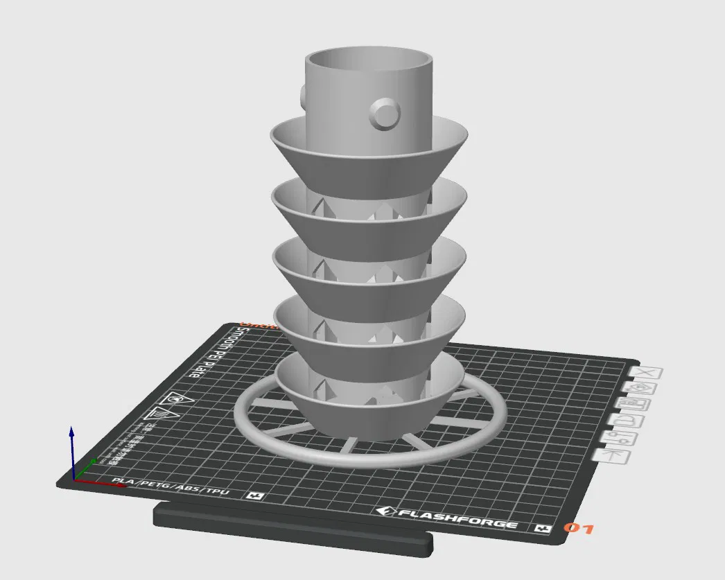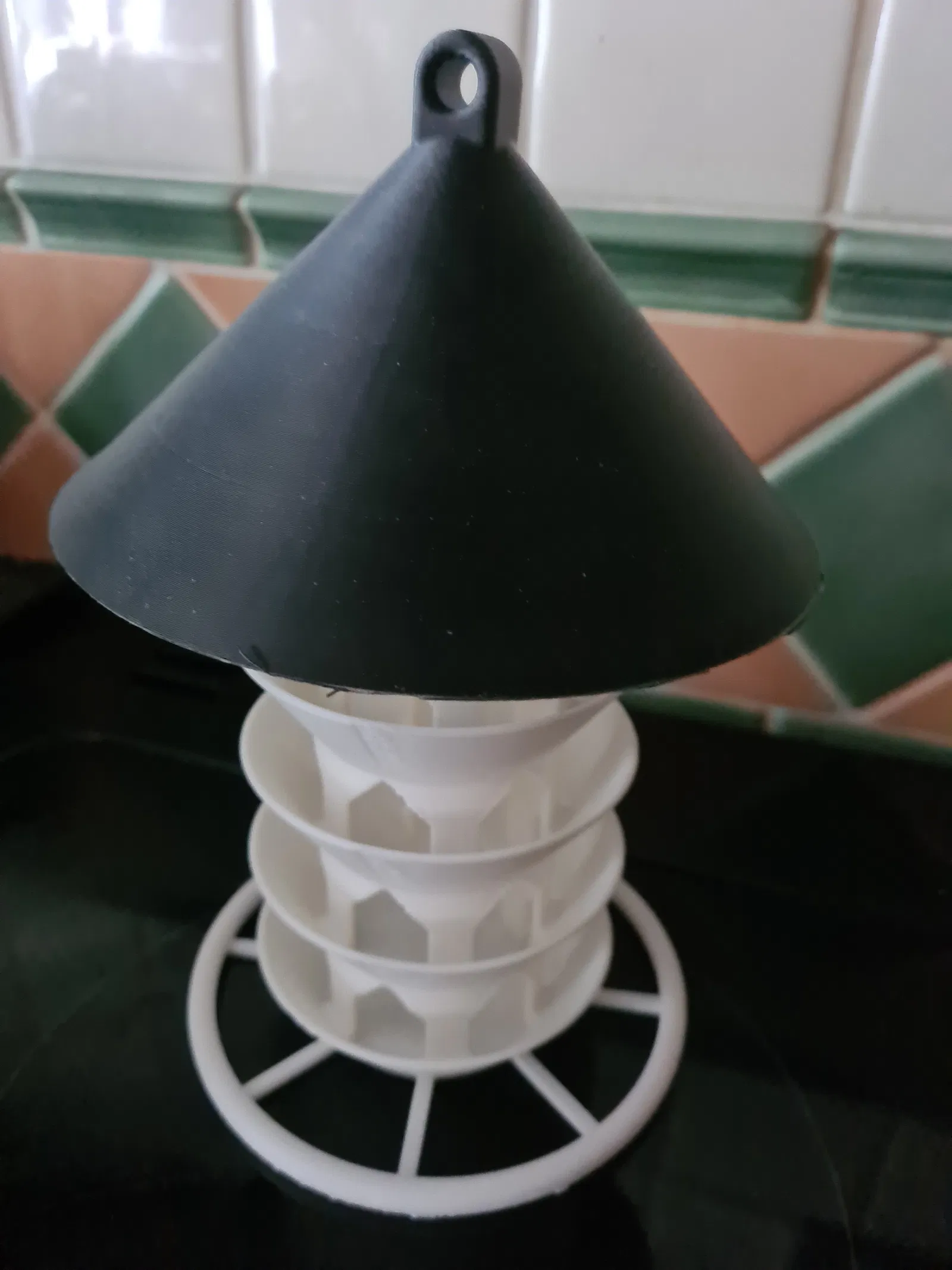 Được đăng tải ngày 12 tháng 3 năm 2026. Tôi đã in thử vài bản từ mẫu thiết kế gốc rất tuyệt vời này, tôi luôn chọn màu trắng cho phần thân máng ăn nhưng thay đổi màu sắc cho phần nắp. Các chú chim thường có thói quen đậu ở tầng dưới hoặc tầng thứ hai để lấy thức ăn thật nhanh rồi bay đi ngay, kiểu như "ăn vội rồi đi" vậy. Vì các chú chim hay đáp xuống tầng dưới hoặc tầng thứ hai nên thức ăn ở tầng dưới thường bị bỏ quên, không được ăn tới và kết quả là bị mốc. Thế nên, để các chú chim cảm thấy thoải mái hơn, nán lại lâu hơn và chịu ăn cả phần thức ăn ở tầng dưới, tôi đã thiết kế thêm một vòng đậu. Phần máng ăn này sử dụng chung nắp với mẫu thiết kế gốc. In bằng nhựa PLA với chiều cao lớp in 0.16mm, infill 15%, khoảng cách brim 0.3mm, không cần support.