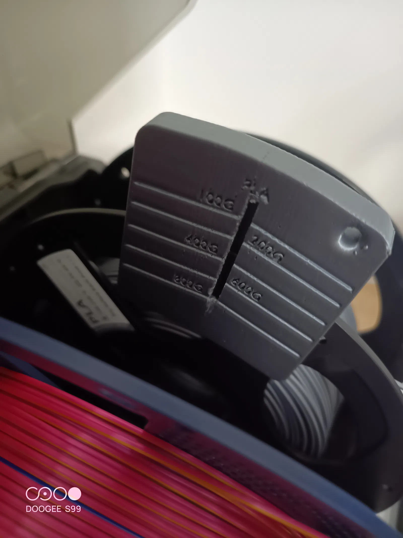 Thiết bị này được thiết kế theo phong cách tối giản, có khả năng kẹp trực tiếp vào vành cuộn nhựa. Trên mặt thước có chia các vạch mức định lượng từ 100g đến 600g (và hơn thế nữa tùy thiết kế), cho phép bạn theo dõi lượng nhựa tiêu hao mà không cần phải tháo cuộn ra để cân trên cân điện tử chuyên dụng. Đây là phụ kiện "cứu cánh" cho những ai thường xuyên in bằng nhựa PLA và muốn tối ưu hóa quy trình quản lý vật liệu in mỗi ngày.