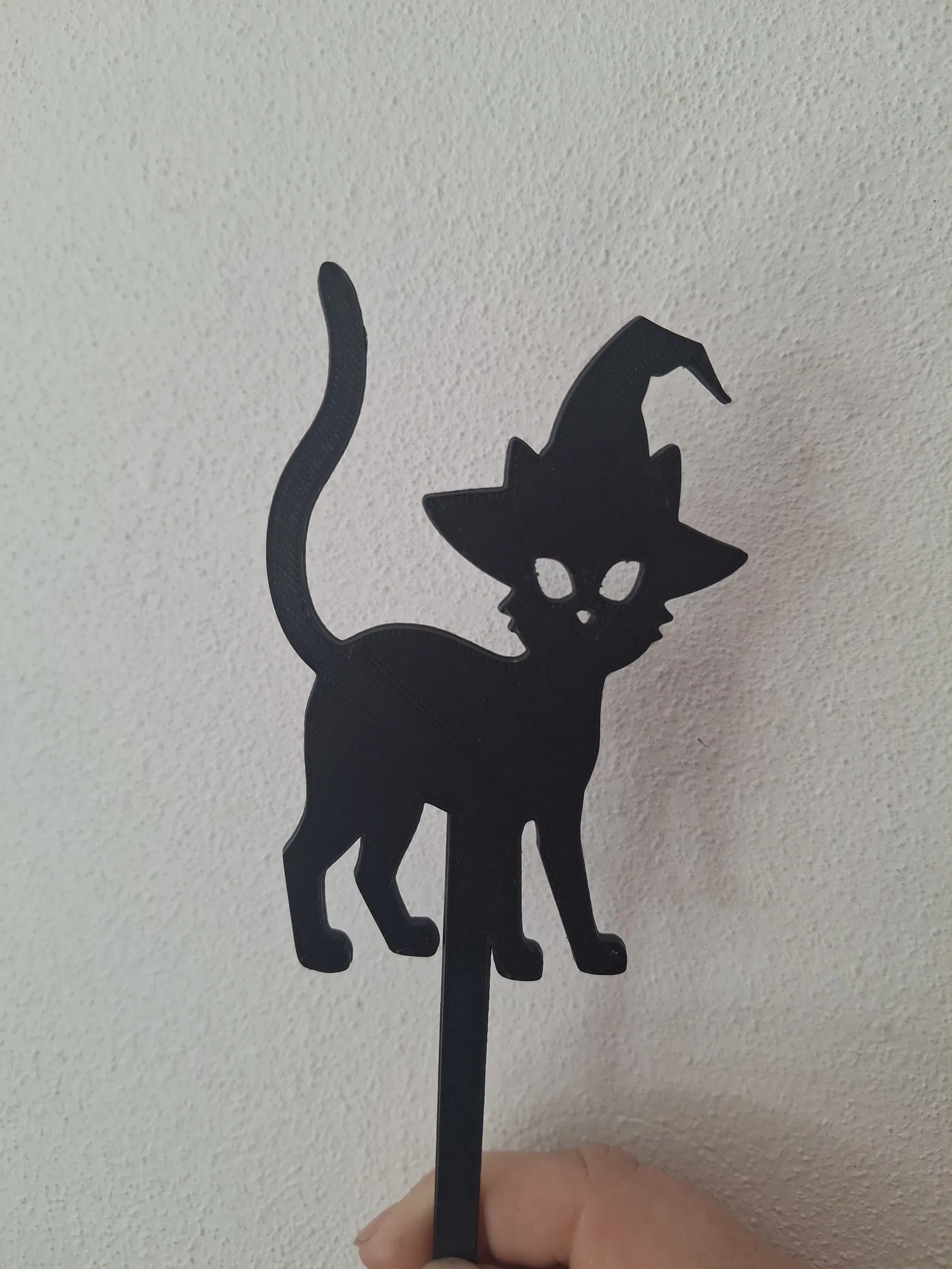 Mô hình 3D chú mèo đội mũ phong cách ma quái, dùng làm phụ kiện cắm trang trí chậu cây cho dịp Halloween. In nhanh chóng từ nhựa PLA Basic chỉ trong 42 phút, trọng lượng 6,12g, là điểm nhấn thú vị cho không gian của bạn.