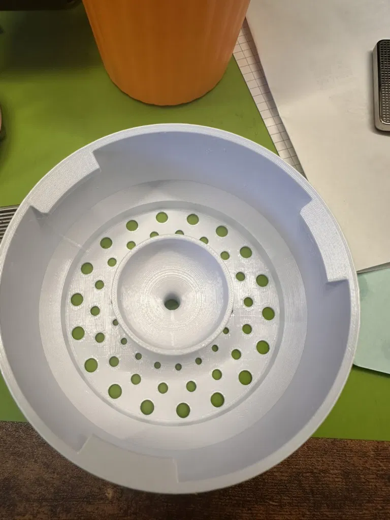 Tui đã làm một cái tháp thủy canh cho mẹ dùng, nhưng nó cứ bị nghẹt hoài do mấy cặn bẩn nhỏ tích tụ, làm máy bơm chạy khô nước luôn. Phiên bản này được thiết kế với ba kích thước lỗ khác nhau, trong đó lỗ lớn nhất được đặt ở phía ngoài ngay trên phần đế của rọ thủy canh để hạn chế tình trạng tắc nghẽn.