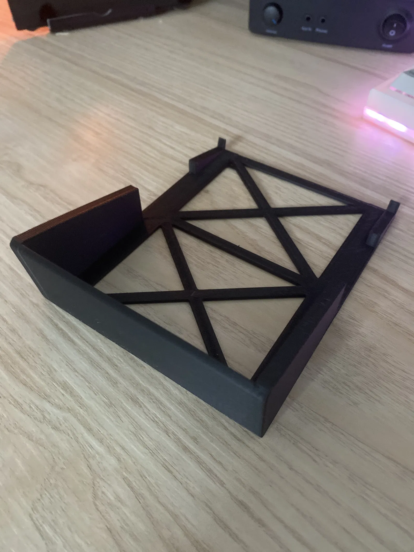 Thiết kế của đế loa này tập trung vào sự tối giản nhưng cực kỳ hiệu quả nhờ cấu trúc dạng lưới (truss) chịu lực bên dưới, vừa giúp tiết kiệm nhựa in, vừa đảm bảo độ cứng cáp cần thiết để nâng đỡ loa mà không lo bị rung lắc. Điểm nhấn đặc biệt ở phiên bản này là phần gờ chặn (wall) phía sau, giúp giữ loa cố định chắc chắn, không bị trượt về phía sau trong quá trình sử dụng. Đây là một giải pháp "ngon, bổ, rẻ" để anh em tự làm mới góc âm thanh của mình bằng công nghệ in 3D.