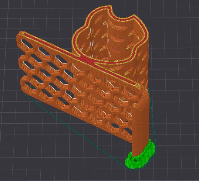 Chiều cao lớp in (Layer height): 0.2 mm Độ đặc (Infill): 15–20% Support: CẦN THIẾT ở phần đế cho cạnh cong (xem hình) Chất liệu: PLA / PETG / ABS (khoảng 50 gram tùy theo độ đặc)