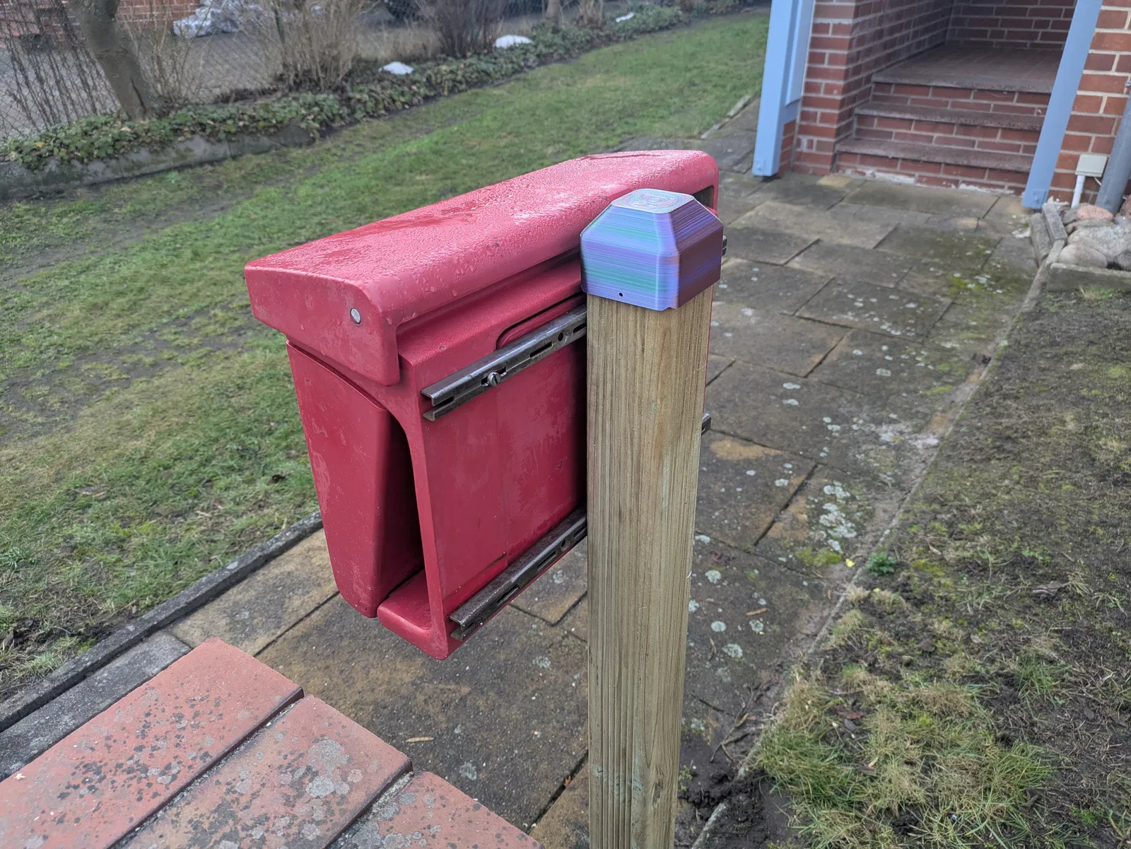 Điểm nổi bật: Mình đã thiết kế thêm phần gờ nhỏ (drip edge/overhang) ở mép nắp. Chi tiết này giúp nước mưa rơi thẳng xuống đất mà không chảy dọc theo thân cột, từ đó giảm thiểu hư hại do ẩm mốc và giúp tăng độ bền cho cột gỗ của bạn một cách đáng kể.