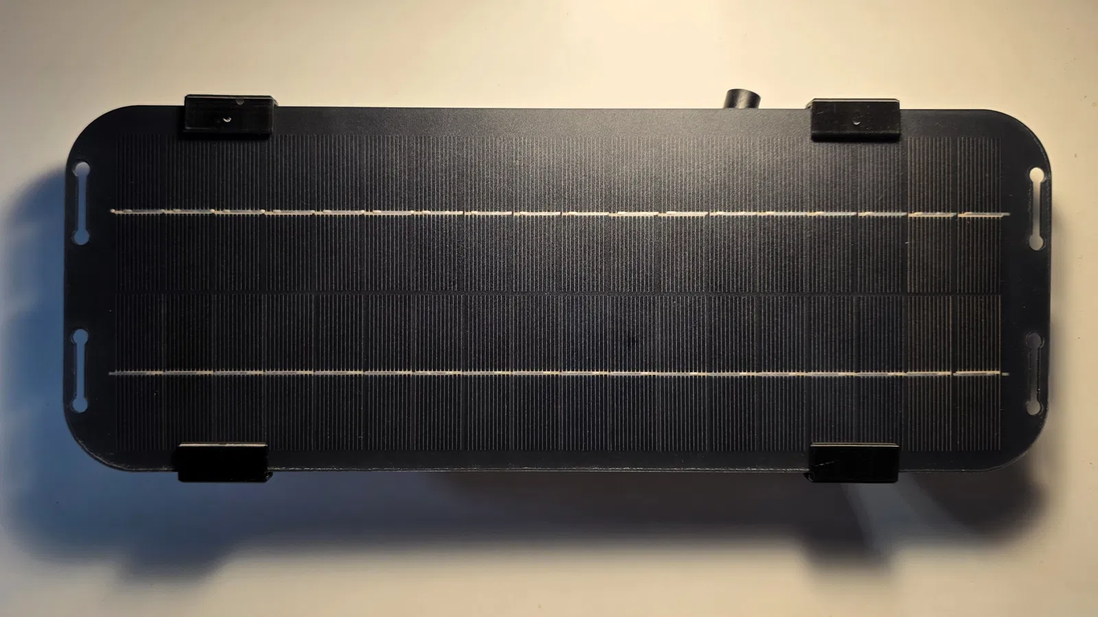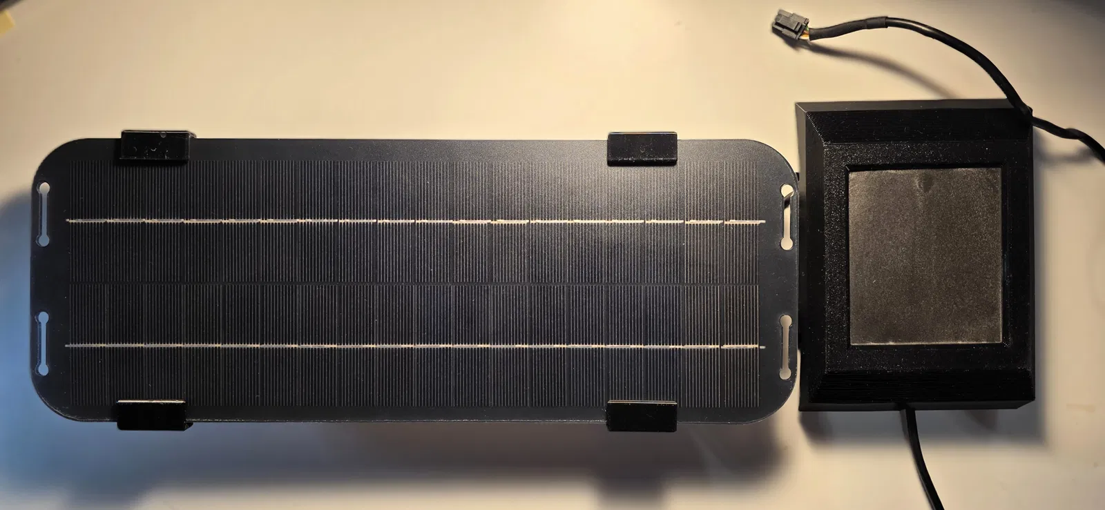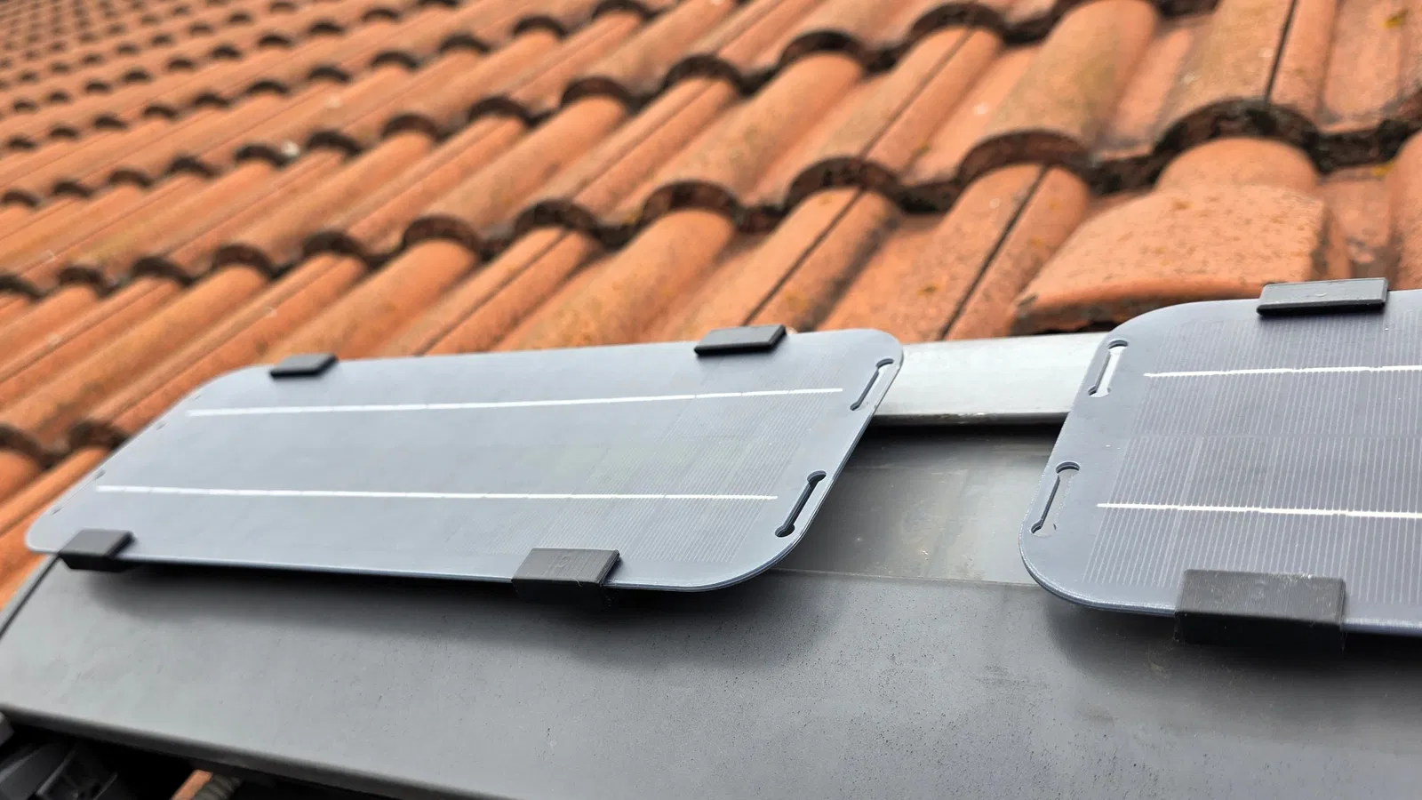 Vì các tấm pin năng lượng mặt trời kính nguyên bản của Velux thường chỉ dùng được khoảng 10 năm và việc thay thế rất khó khăn hoặc tốn kém, mình đã thiết kế một giá đỡ có thể điều chỉnh góc độ cho các tấm pin mặt trời 12V loại linh hoạt từ Trung Quốc (nếu link lỗi, hãy dùng tìm kiếm bằng hình ảnh) để gắn trực tiếp vào rãnh profile nguyên bản của Velux.