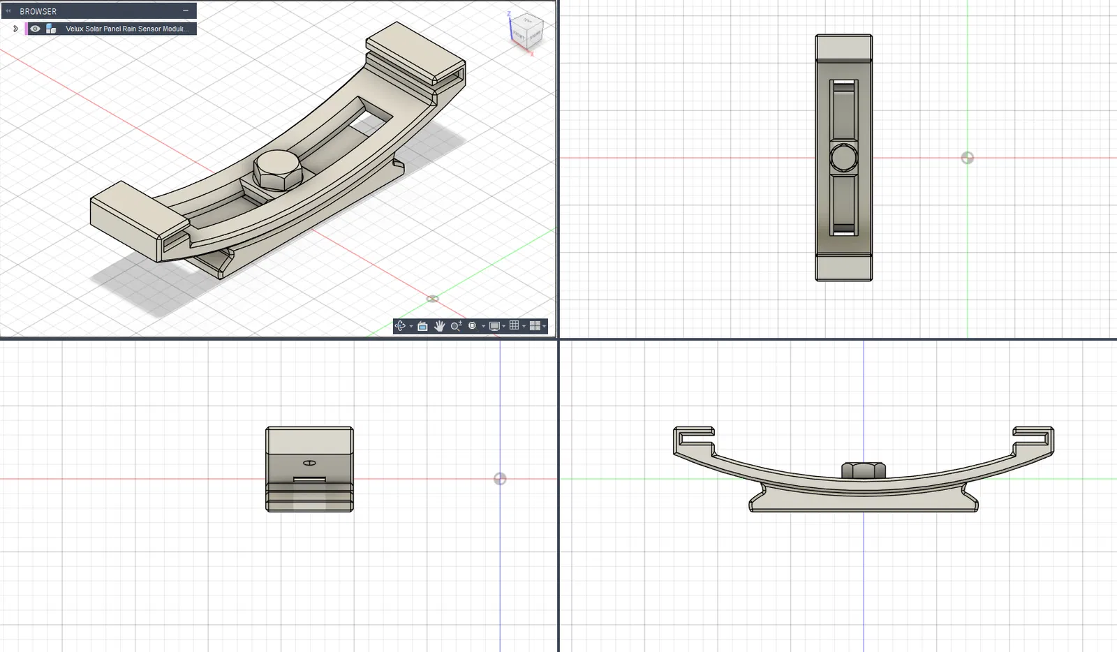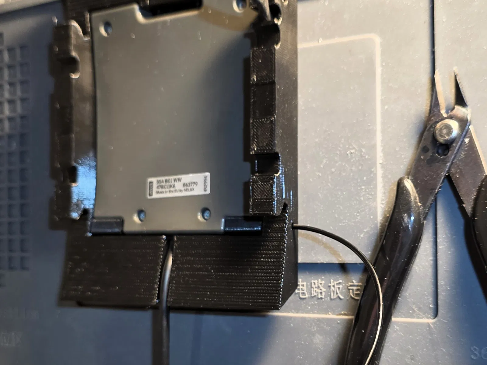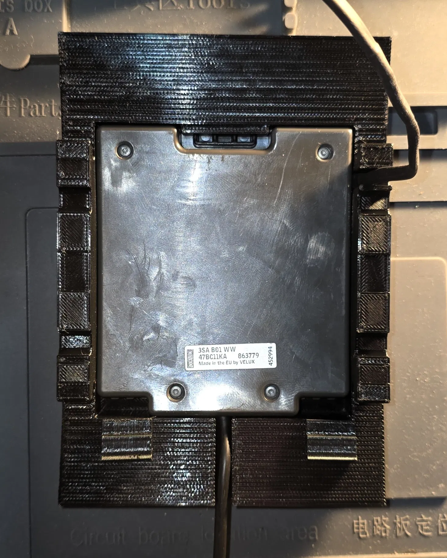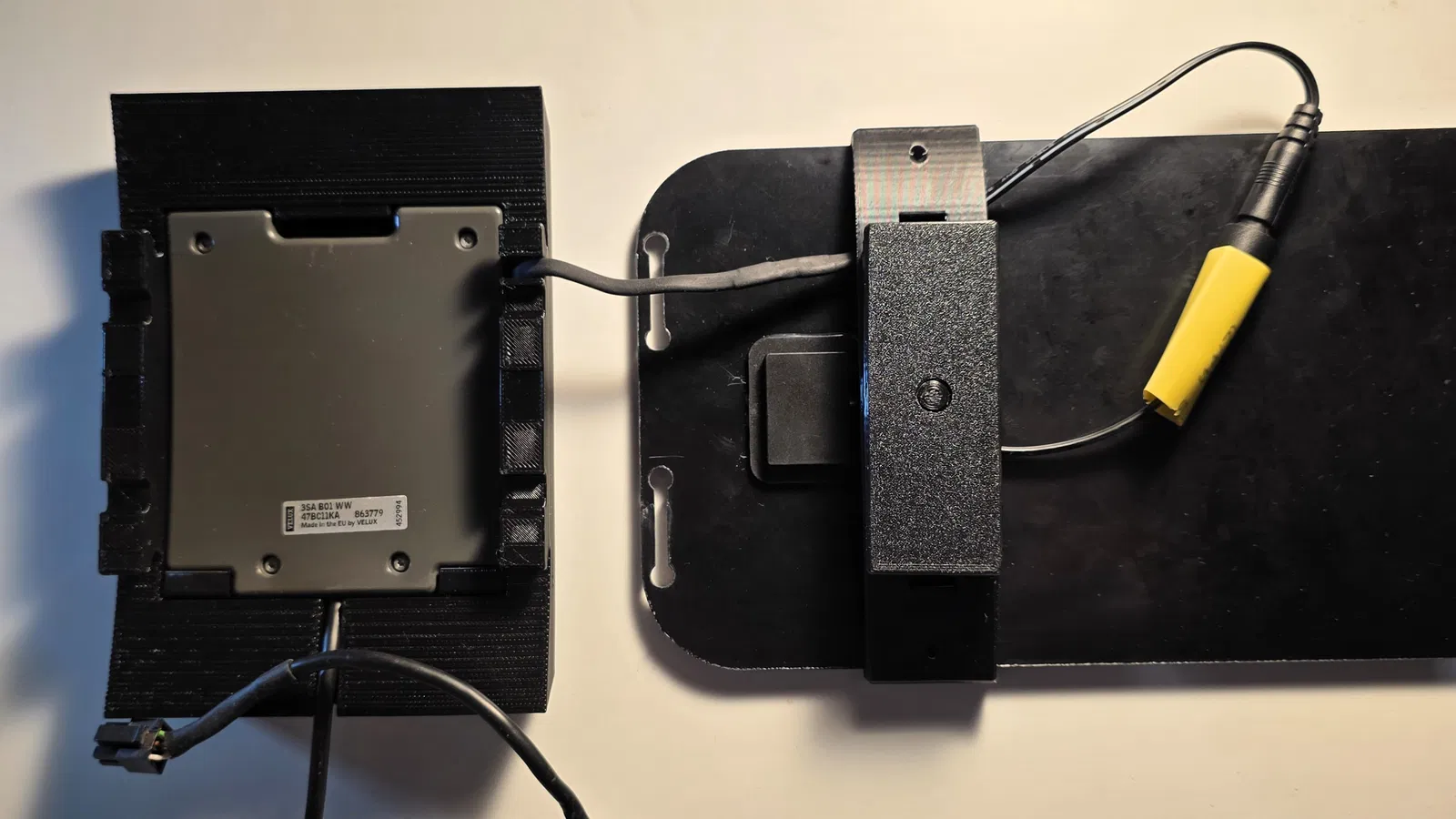 Vì cần tháo bỏ giá đỡ cũ – nơi chứa cảm biến mưa (3SA B01 WW) của cửa sổ Velux – nên mình cũng đã thiết kế một giá đỡ mới cho cảm biến này, có tích hợp sẵn đường đi dây cáp. Cảm biến chỉ cần kẹp từ dưới lên và khóa lại bằng hai chốt. Bạn dùng các đoạn nhựa in (filament) ngắn xuyên qua lớp vỏ ngoài để cố định chốt. Việc giữ lại cảm biến mưa không chỉ đảm bảo tính năng tự động đóng cửa khi trời mưa mà còn giúp duy trì logic kết nối ban đầu một cách mượt mà.