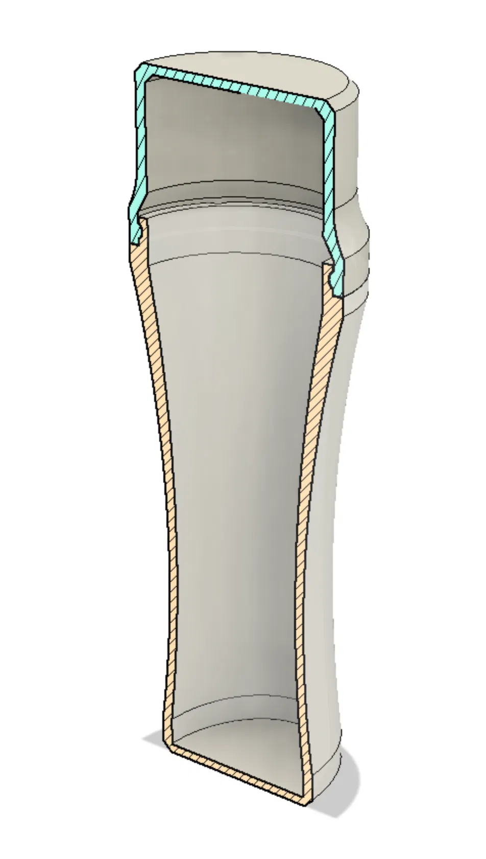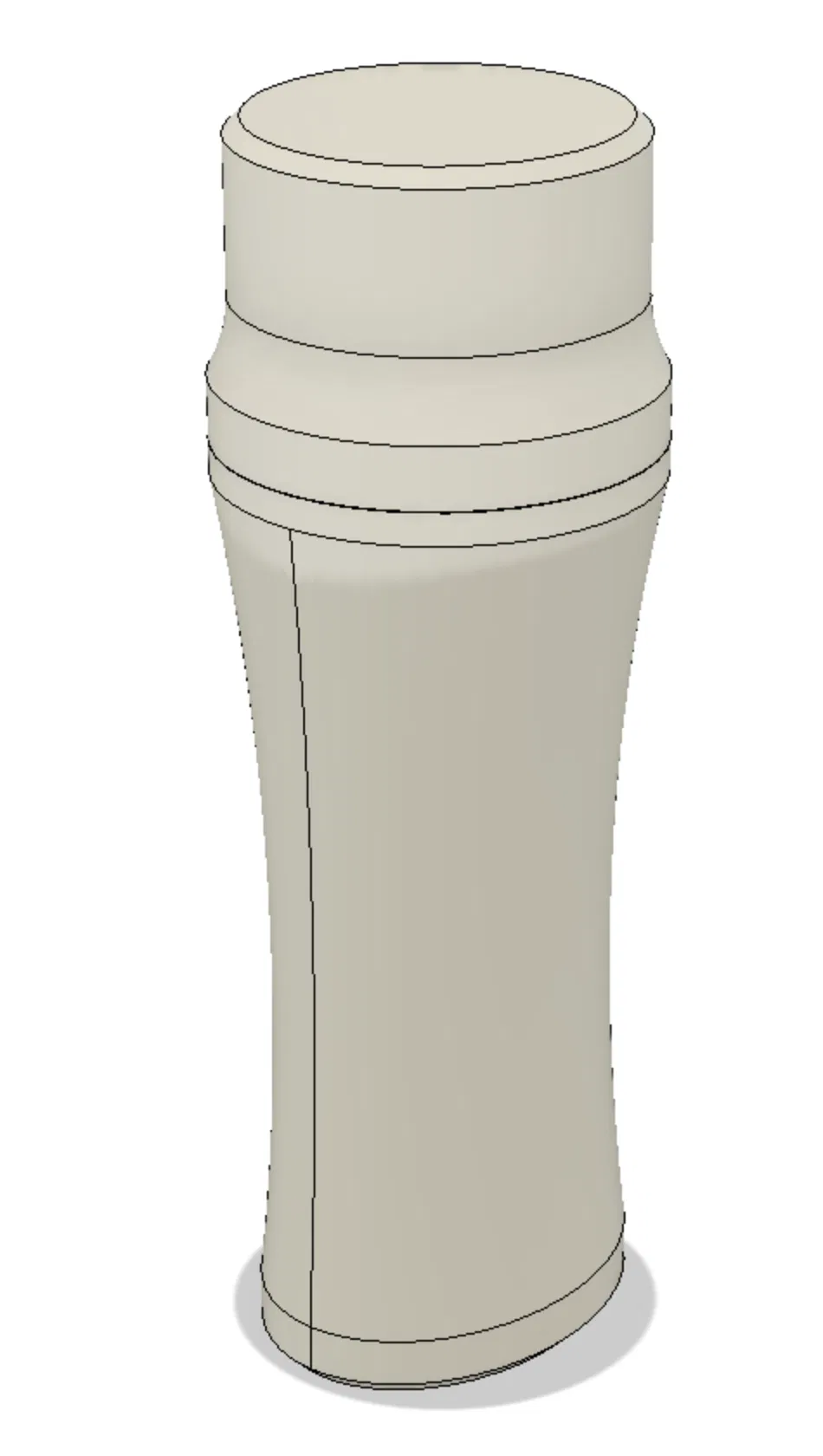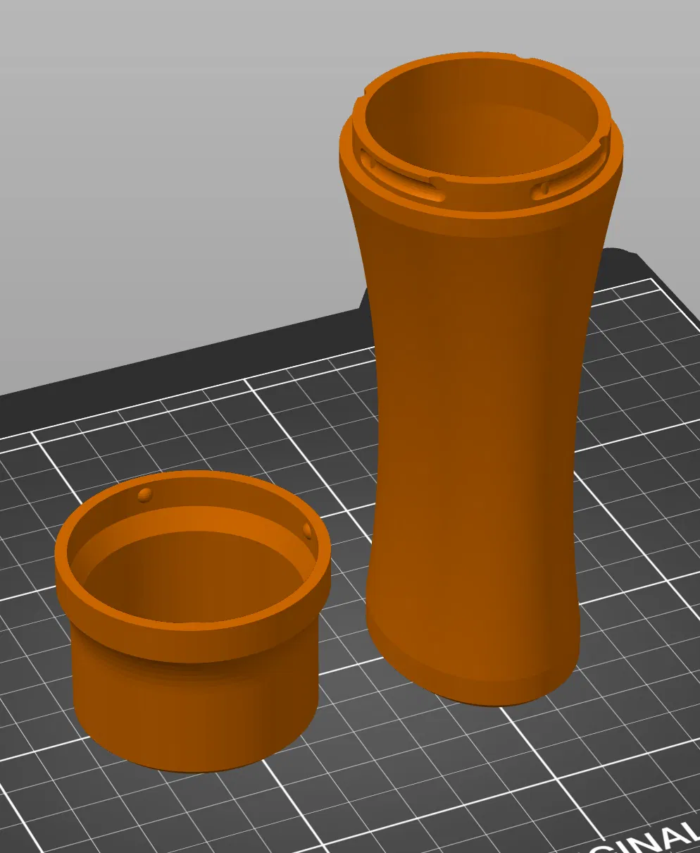 Thiết kế tham số hóa cao thực hiện trên Fusion 360 (có đính kèm file F3D). Kích thước thô là cao 154mm (đã lắp nắp vào hộp), đường kính 54mm (tại khớp nối nắp và thân). Chiều cao bên trong là 150mm. Phần hẹp nhất của hộp là hình elip 44mm x 32mm.