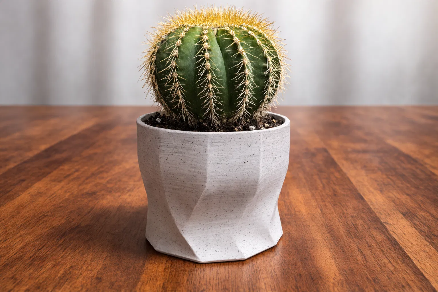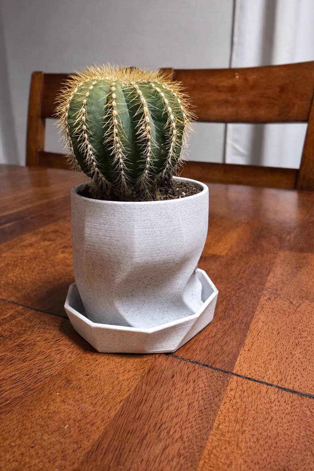 Đây là mẫu chậu cây hình học đa diện được thiết kế dành riêng cho các loại xương rồng và cây mọng nước nhỏ. Những mặt phẳng xoắn tinh tế tạo nên vẻ ngoài hiện đại, điêu khắc nhưng vẫn giữ được hình dáng đơn giản để in ấn dễ dàng. Các bề mặt nghiêng bắt sáng ở những góc độ khác nhau quanh chậu, mang lại vẻ sinh động hơn hẳn so với những loại chậu tròn thông thường.