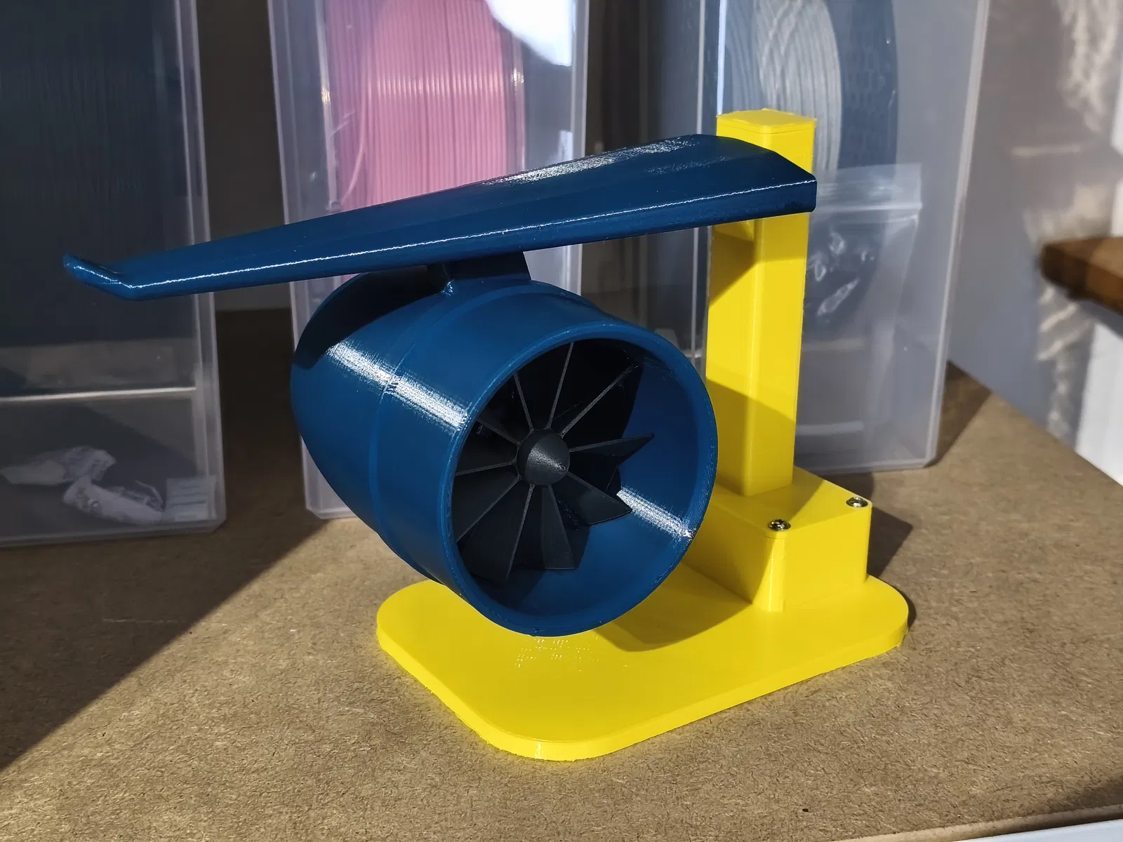 Mình in mẫu này bằng nhựa PETG và PCCF (cho phần cánh quạt). Mình có sử dụng thêm động cơ 6V với tốc độ 14500 RPM để làm nó vận hành.