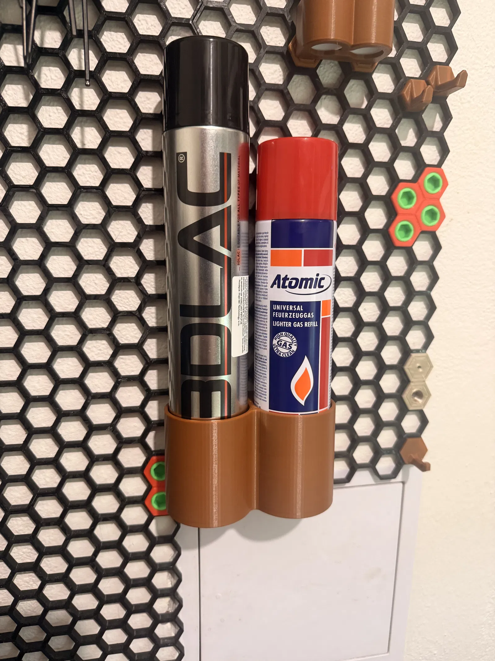 Nếu anh em đang sử dụng hệ thống bảng treo HSW (Honeycomb Storage Wall) để tối ưu không gian làm việc, thì chắc chắn món phụ kiện này sẽ rất hữu ích. Đây là mẫu thiết kế giá treo chuyên dụng, được tạo ra để anh em cất giữ bình xịt 3DLACK tăng độ bám dính bàn in cùng với một bình gas mini nạp bật lửa. Thay vì để lộn xộn trên bàn làm việc khiến không gian trở nên bừa bộn và khó tìm kiếm mỗi khi cần, anh em chỉ cần gắn giá treo này trực tiếp lên bảng HSW của mình. Với cấu trúc dạng ống chắc chắn, các món đồ nghề quan trọng của anh em sẽ luôn được giữ cố định, ngăn nắp và luôn trong tầm tay khi cần sử dụng cho các dự án in 3D.