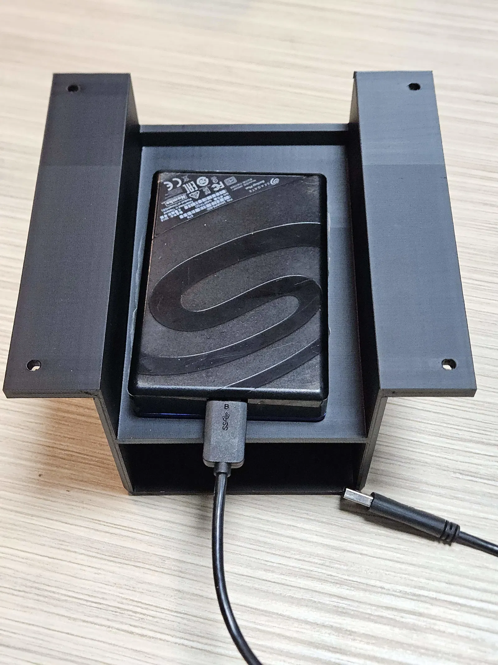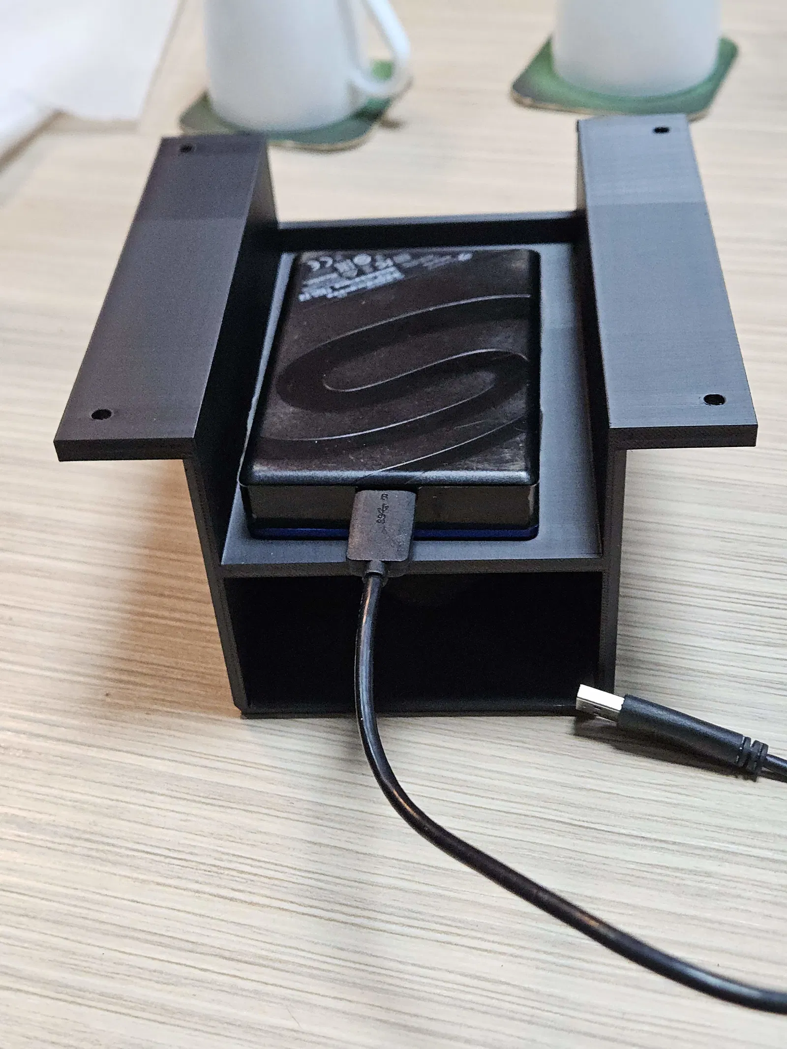Giải pháp giá đỡ gắn dưới bàn giúp sắp xếp gọn gàng hai ổ cứng 2.5" HDD hoặc SSD. Thiết kế in nguyên khối theo chiều dọc, hoàn toàn không cần support, tích hợp khe thông gió giúp ổ cứng luôn mát và giữ cáp kết nối không bị gập.