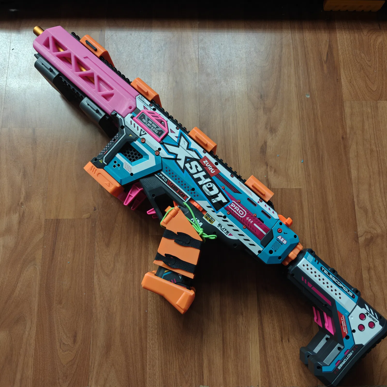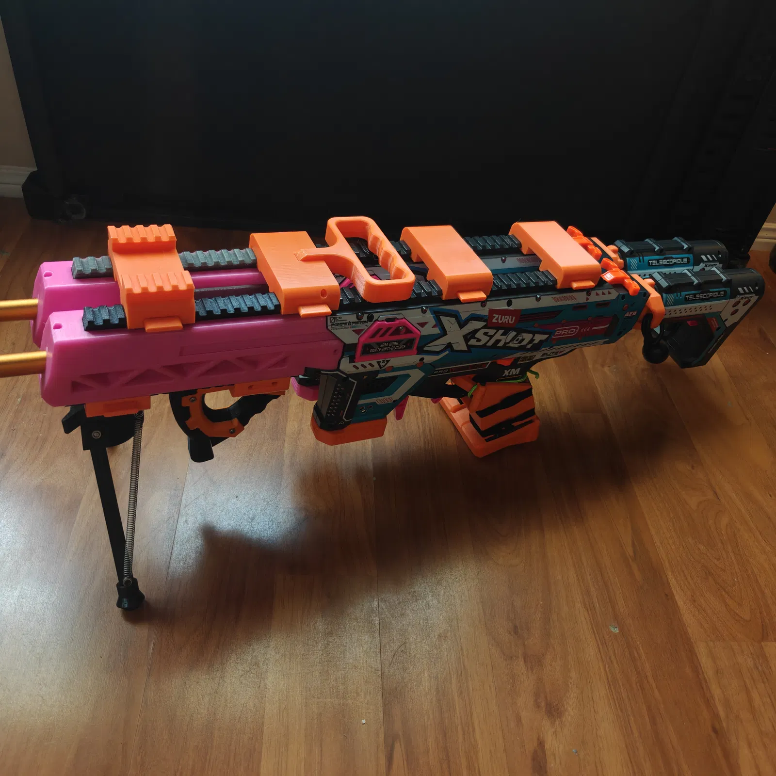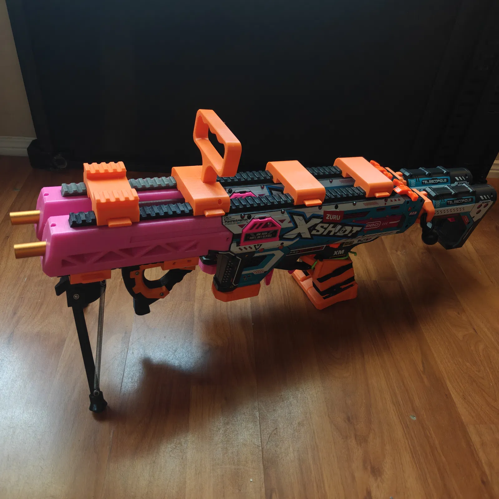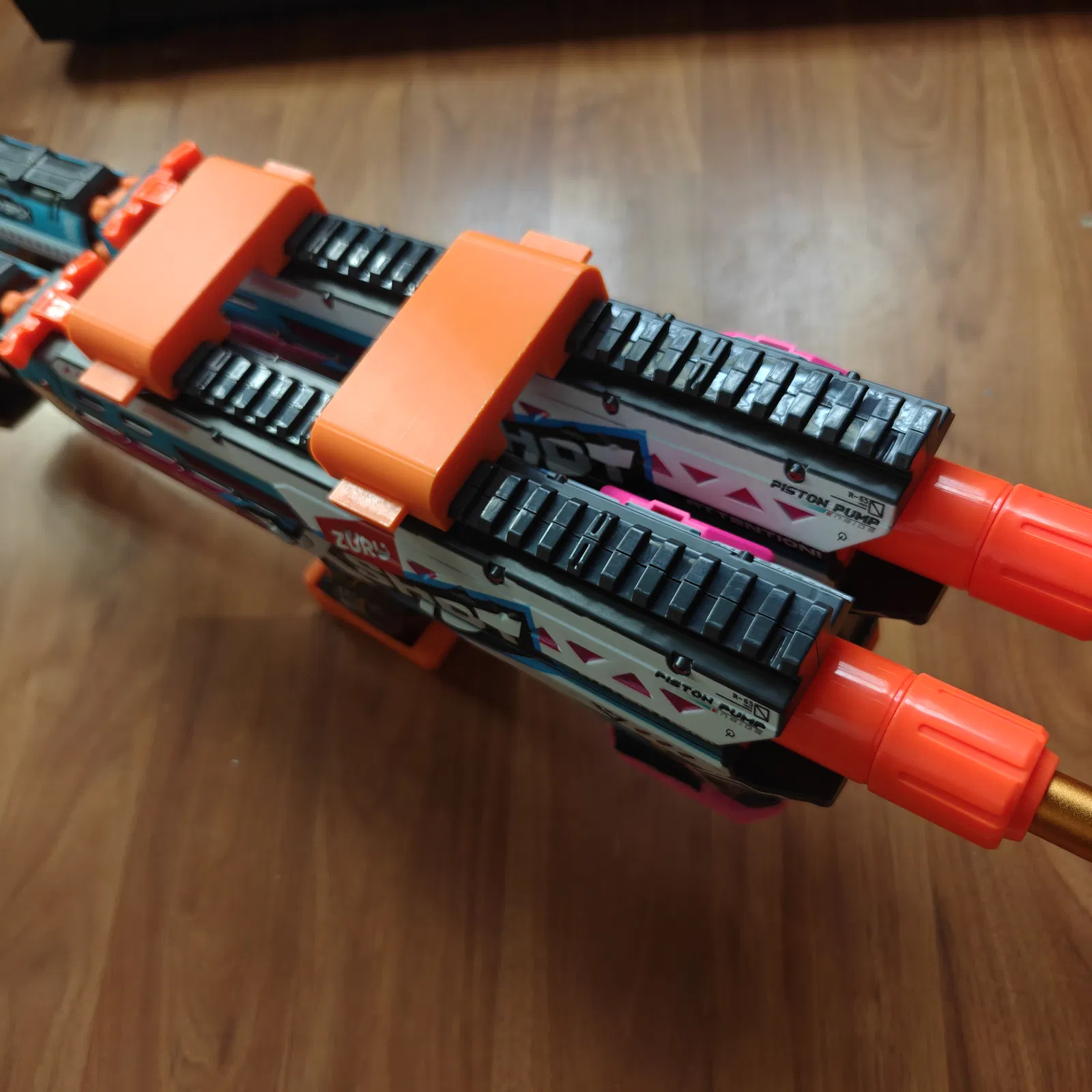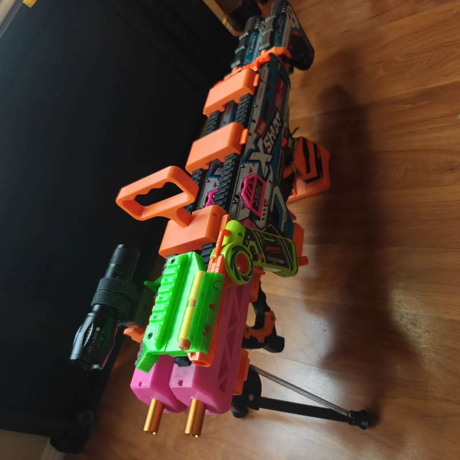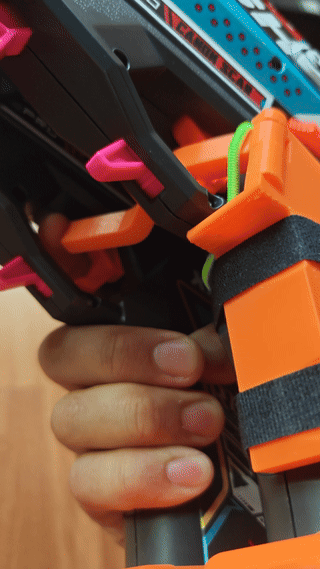 Nhân đôi tốc độ bắn cho chiếc PP của bạn chỉ với một mẹo đơn giản này! Gắn thêm một chiếc PP nữa vào bằng bộ kit Double PP! (P^4? Dual-Channel PP? PPPP? Pianississimo? 2P2Furious? ) Bạn có thể bắn từng phát một, bắn cả hai, hoặc bắn cả hai cùng lúc với độ trễ bằng một ngón tay bóp cò! Ưu điểm: bắn nhanh gấp đôi (đại khái vậy) Nhược điểm: nặng gấp đôi (~8lbs) tốn kém gấp đôi độ chính xác không tăng gấp đôi nạp đạn lâu hơn và cồng kềnh hơn không gắn được ổ đạn (drum) khó gỡ kẹt đạn vì cửa thoát đạn bị chặn có lẽ sẽ không thoải mái nếu bạn có bàn tay lớn hoặc ngón cái rộng hơn khe hở 26mm giữa hai tay cầm. Phụ kiện không in: ít nhất 2 sợi dây / khóa dán (velcro) / băng keo / hoặc loại dây buộc bất kỳ cho phần gắn đòn bẩy một ốc vít 3M 20+mm / dây móc áo / hoặc vật dụng tương tự cho trục xoay đòn bẩy * tùy chọn - thun cao su hoặc vật liệu đàn hồi quấn quanh tay cầm đòn bẩy để tránh bị lỏng lẻo khi không sử dụng. Bạn chỉ thực sự cần 2 giá đỡ picatinny và phần đế tay cầm để có kết nối chắc chắn, hãy lật ngược (mirror) đòn bẩy và giá đỡ nếu bạn là người thuận tay trái.