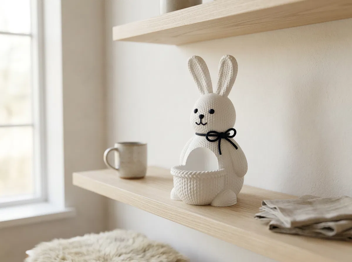 Vừa dễ thương lại vừa thích hợp để trưng bày: Giá đỡ trứng Phục sinh hình chú thỏ với bề mặt nhám này là một món đồ trang trí mùa xuân ngọt ngào, được thiết kế để giữ và làm nổi bật những quả trứng trang trí. Chú thỏ có bề mặt tạo cảm giác như đan len đầy tinh tế, kết hợp với phần giá đỡ hình trái tim cực xinh giúp quả trứng của bạn luôn đứng vững và ngay ngắn. Được in 3D từ nhựa nhám, sản phẩm trông rất sạch sẽ, hiện đại và làm nổi bật các chi tiết dưới ánh sáng tự nhiên — cực kỳ hoàn hảo để trang trí bàn ăn ngày lễ Phục sinh, kệ sách, góc trưng bày theo mùa, phòng của bé hoặc làm quà tặng.