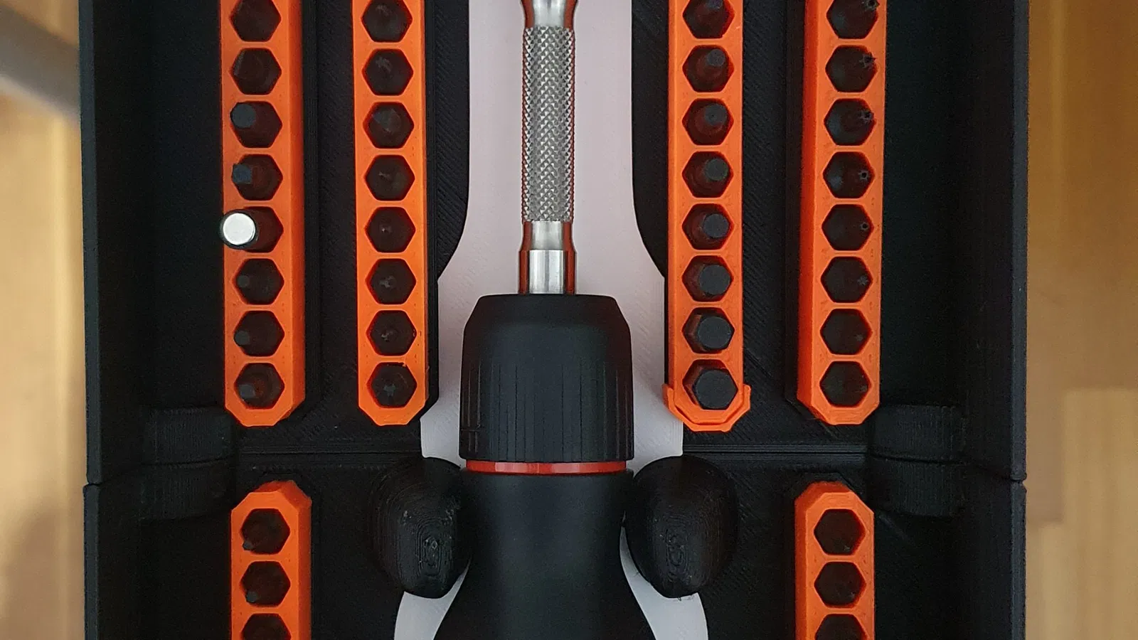 -các giá đỡ bit không cần hỗ trợ và vỏ nam châm có thể được in với cầu cơ bản, vì vậy hãy đặt nó phẳng với lỗ lục giác đối diện với bàn để có độ chính xác kích thước tối đa.