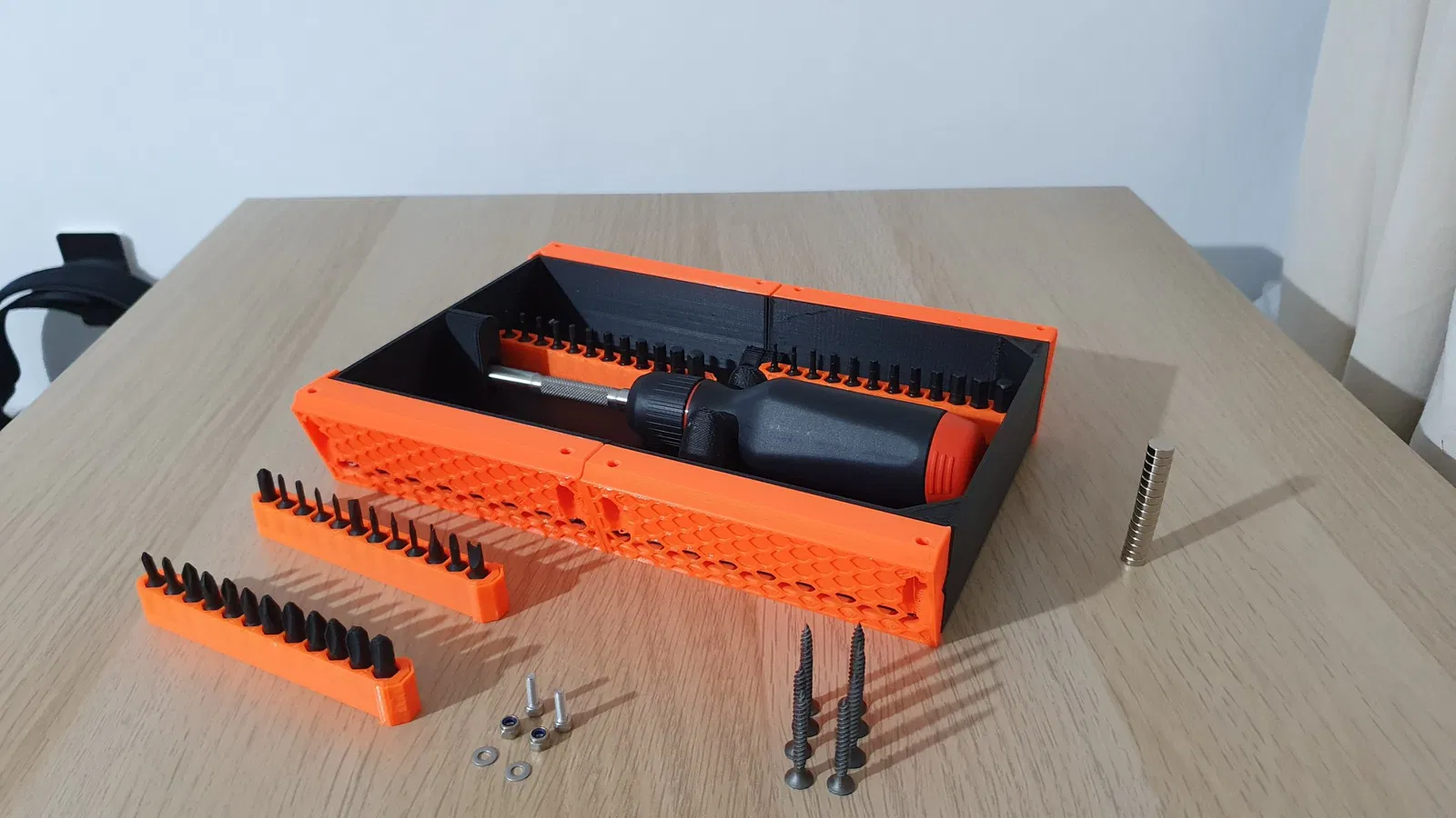 - 84 nam châm tròn neodymium 8mm (đường kính) x 3mm (mỗi giá đỡ bit có 12 và rất mạnh) -1 cơ chế đẩy/mở/ikea BESTÅ (hầu hết các cơ chế đẩy/mở sẽ hoạt động tốt) -2 vít M3x12mm với các đai ốc tương ứng (để nối hai nửa của ngăn kéo chính) -2 vít M3x6mm (để hoạt động như các chặn ngăn không cho toàn bộ ngăn kéo ra khỏi ray ở phía trước) -12 vít gỗ/không chắc về thông số của những cái này, (để cố định các ray và cơ chế đẩy mở vào bàn.)