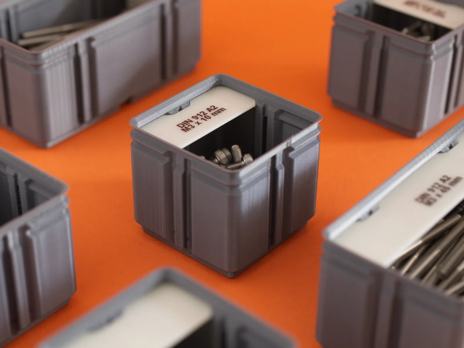 Giờ đây mình nhóm các ngăn riêng lẻ theo loại linh kiện, độ hoàn thiện và đường kính, sau đó sắp xếp chúng theo chiều dài. Để giữ cho góc làm việc trông sạch sẽ, mình chọn dán nhãn kín đáo ở cạnh hoặc mặt dưới của hộp, đảm bảo vẻ ngoài gọn gàng và tinh tế.