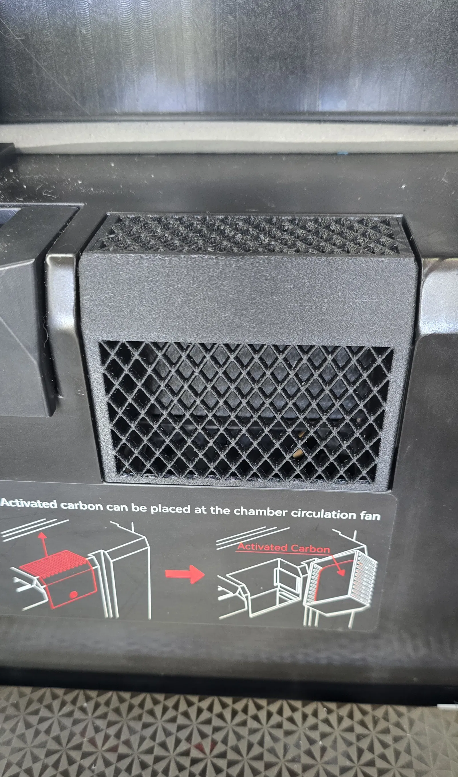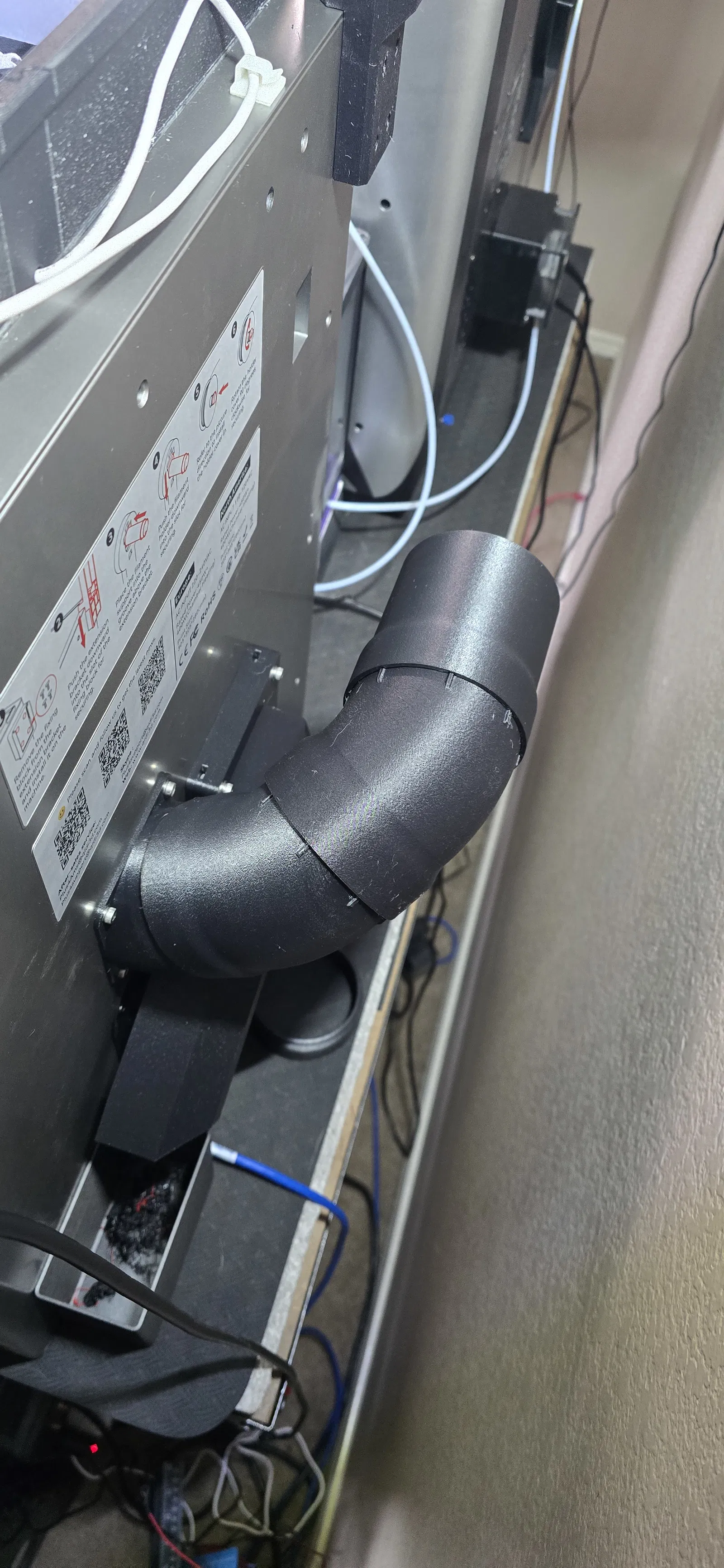 Tôi đã đặt một đầu dò nhiệt trong buồng gần khung túi lọc và một đầu dò khác sau đầu ra ống xả, kết quả cho thấy luồng khí thoát ra chỉ nhỉnh hơn nhiệt độ phòng một chút. Có vẻ như túi lọc đã chặn hoàn toàn luồng khí nóng từ buồng in và quạt chỉ đang hút không khí từ buồng bo mạch để đẩy ra ngoài. Túi lọc gần như không có tác dụng, và quạt cũng chẳng hỗ trợ làm mát nếu buồng in trở nên quá nóng.