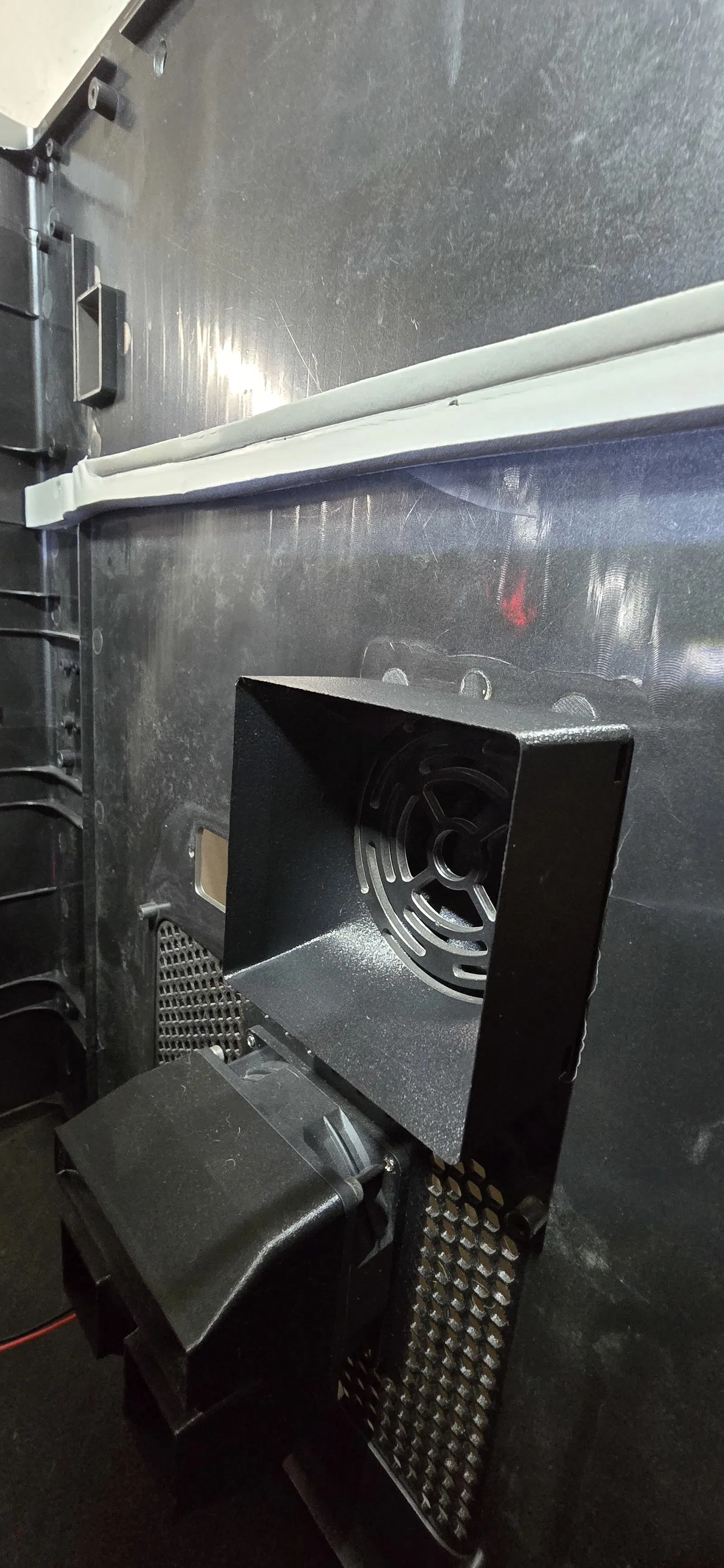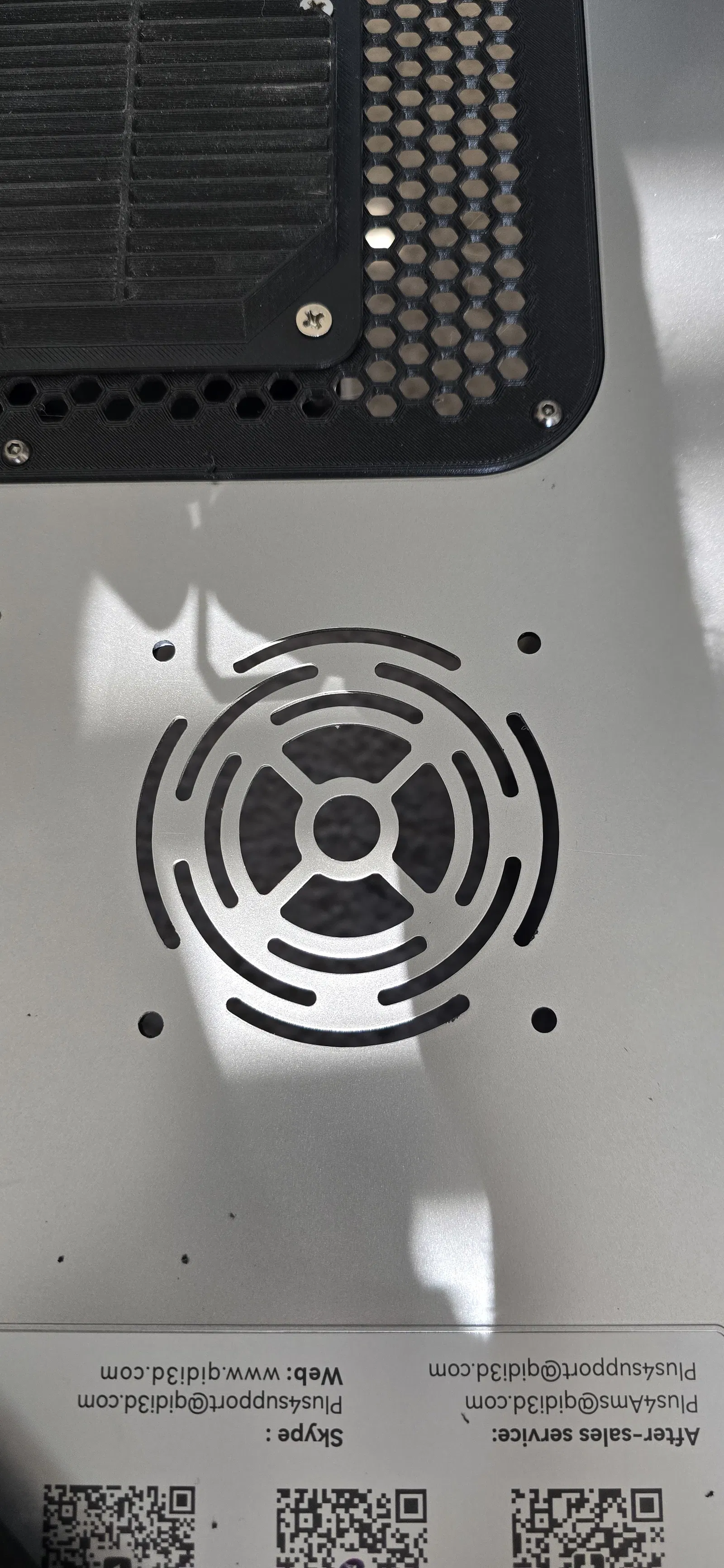 Thêm vào đó, phần ống dẫn bên trong quạt chỉ đặt hờ vào mặt sau vỏ máy, không có gì ngăn khí rò rỉ trực tiếp vào buồng bo mạch. Điều này làm tăng nhiệt độ bên trong buồng bo mạch khi tháo túi lọc. Qidi Plus 4 cũng không có sẵn các lỗ để lắp ống dẫn.