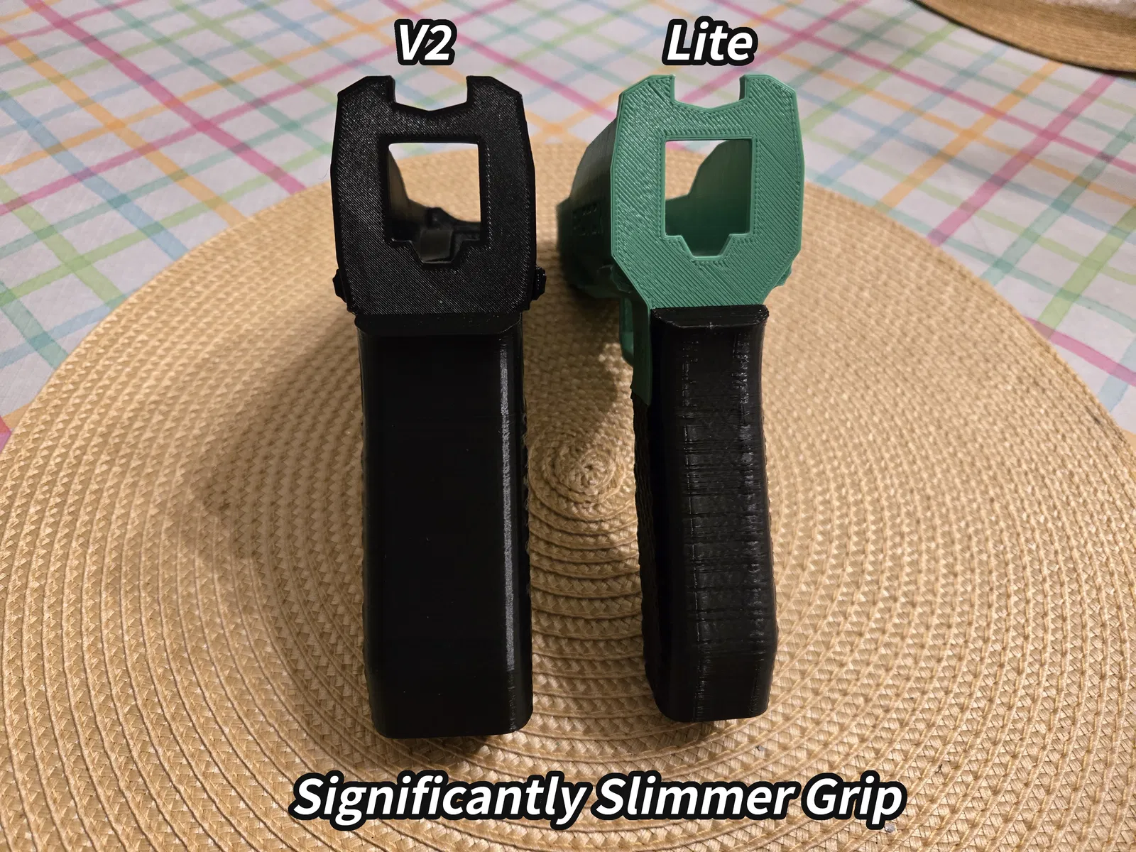 Chỉ có thân súng và tay cầm là được thay đổi; đầu ruồi, thanh trượt cò và lò xo cò vẫn giữ nguyên như bản V2 gốc. (Bỏ qua vệt ngang ở phần trước thân súng trong hình nha, do lúc in đầu in làm đổ một cái support khiến thân súng bị nhấc lên khỏi bàn in ở mức 90%, mình tiếc nhựa nên in tiếp 10% còn lại rồi dán vào, còn file 3D gốc thì hoàn toàn bình thường).