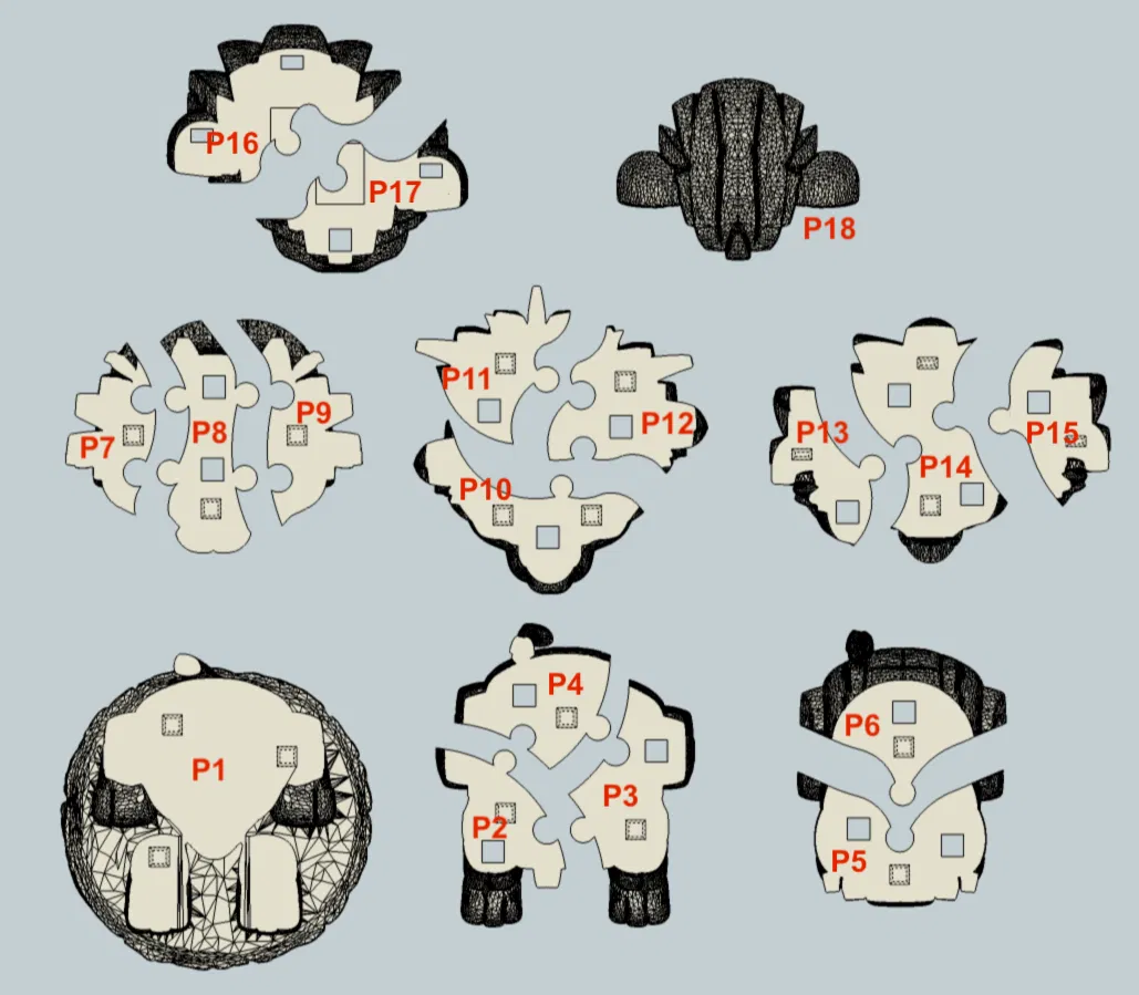 - Cấu trúc sản phẩm: Mô hình gồm tổng cộng 18 mảnh ghép riêng biệt (từ P1 đến P18) cần được in và lắp ráp.