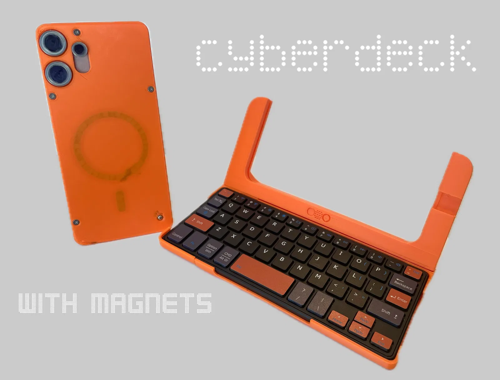 Khung cyberdeck có sẵn khe hở để đi dây sạc, đảm bảo điện thoại của bạn không bao giờ bị hết pin. Bàn phím kết nối qua Bluetooth và được gắn vào khung một cách chắc chắn.