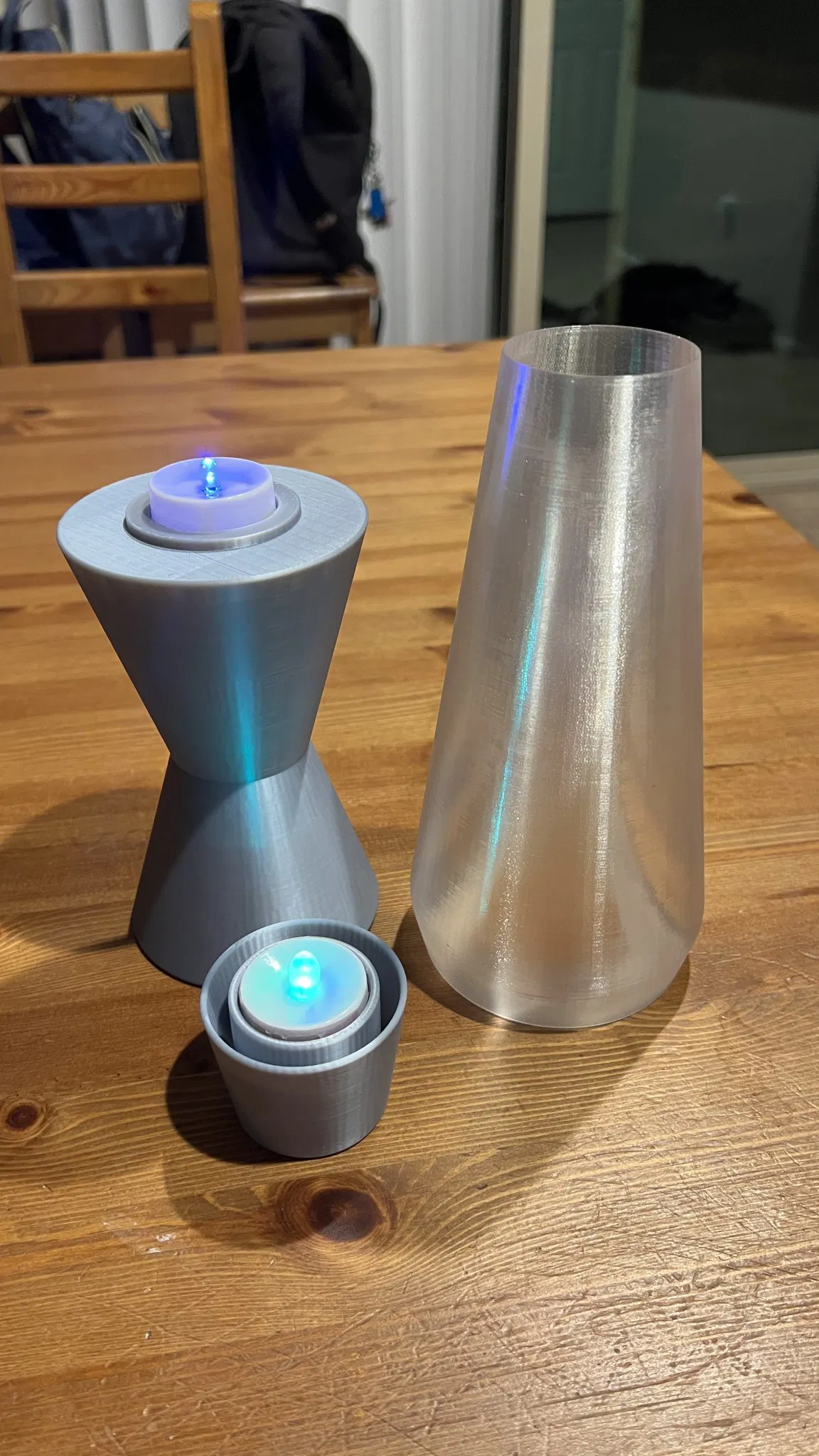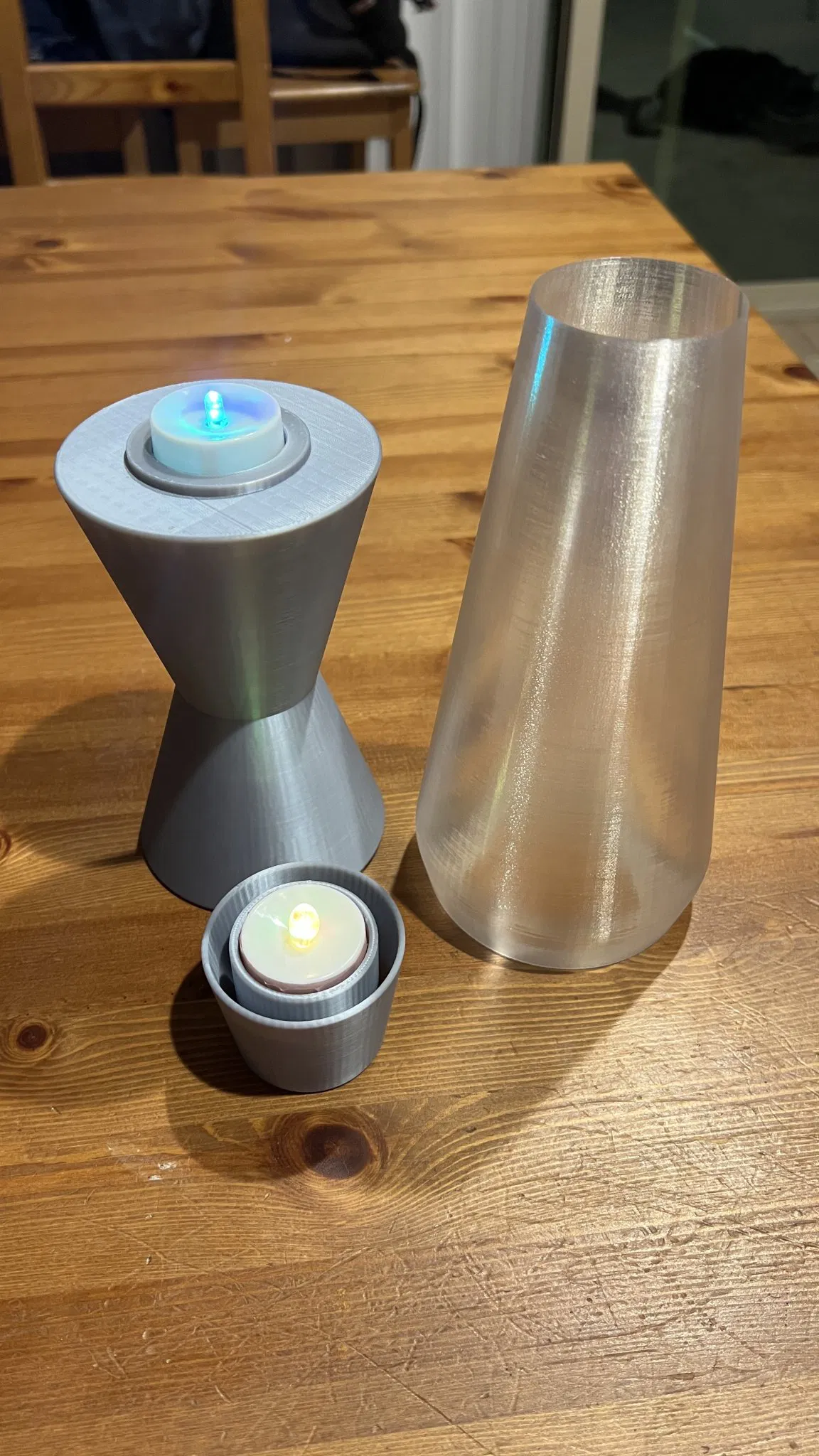 Làm đơn giản. In phần trong suốt ở chế độ bình, sử dụng một loại filament trong suốt hoặc loại filament bán trong suốt yêu thích khác của bạn. Đèn tealight có thể được lắp đặt ở trên và dưới để tạo ra các hiệu ứng khác nhau. Nếu bạn muốn nâng cao một chút, hãy sử dụng một số NeoPixels để có một buổi trình diễn ánh sáng tuyệt vời. Thưởng thức!