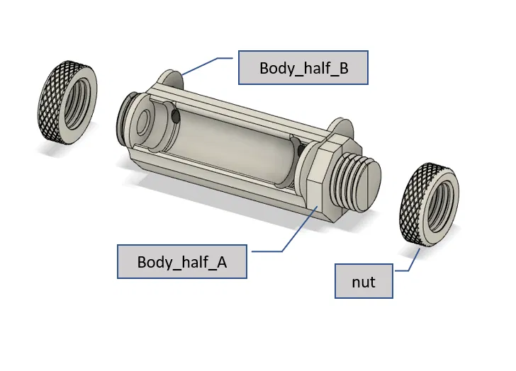 • Cần in: 4x roller_half, 1x body_half_A, 1x body_half_B, 2x nut.