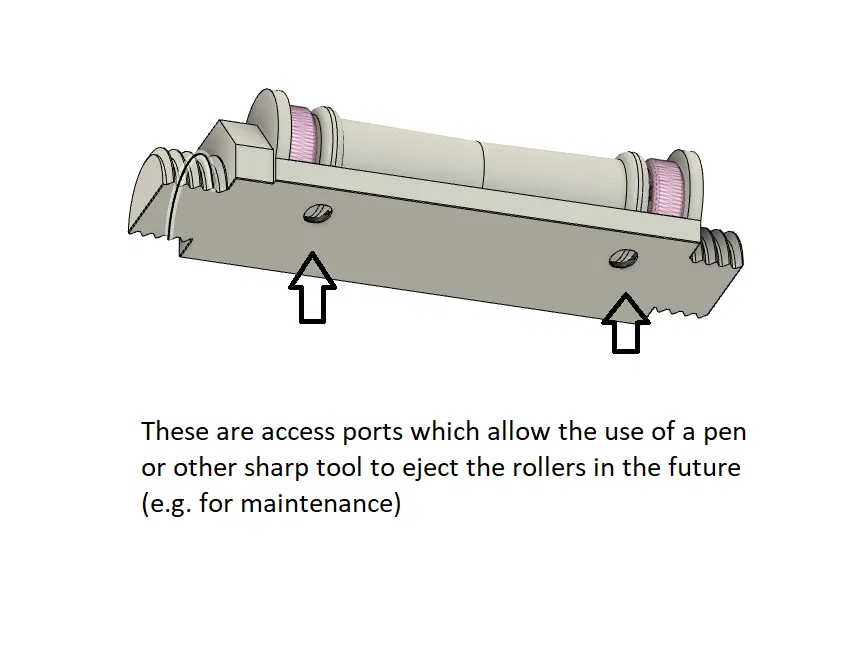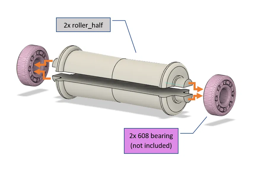 • Thân và con lăn được thiết kế để in làm hai nửa. Các nửa con lăn được lắp bằng cách ép vòng bi 608 vào các đầu đối diện. Các nửa thân được lắp lại bằng cách siết đai ốc ở cả hai đầu. Các con lăn sau khi lắp ráp sẽ khớp vào vị trí trên thân máy. Xem thêm ảnh nhé.