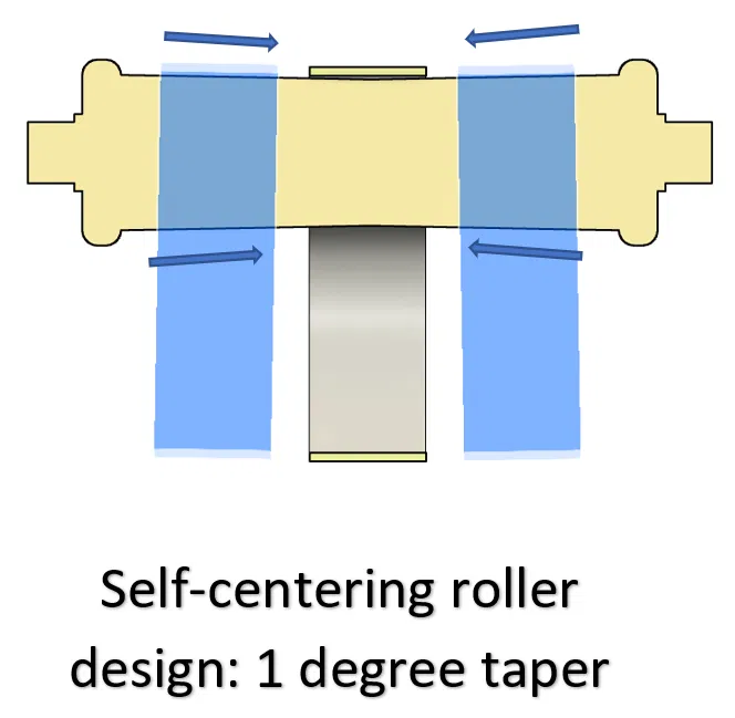• Bề mặt con lăn được vát nhẹ 1 độ về phía giữa để giúp cuộn nhựa tự căn giữa.