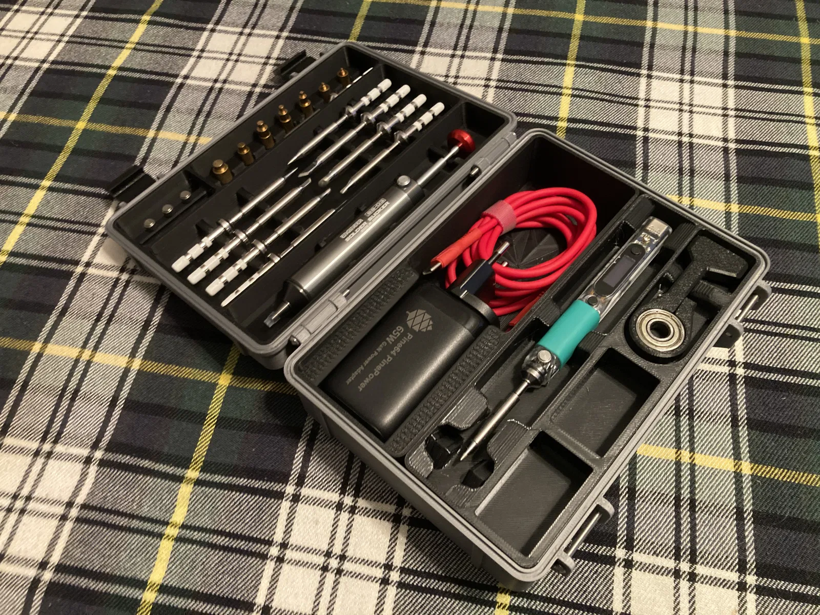 Hiện nay có rất nhiều mẫu hộp được thiết kế rất đẹp để sắp xếp các bộ dụng cụ hàn Pinecil… nhưng chưa có mẫu nào thật sự đúng ý mình, nên mình đã tự tay thiết kế một cái để góp thêm vào bộ sưu tập đó. Thiết kế của mình được tối ưu để chứa Pinecil V2 cùng toàn bộ các phụ kiện chính hãng của Pine64: