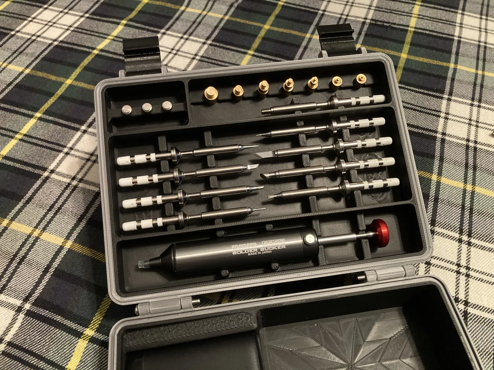 Hộp đựng tùy chỉnh giúp bạn sắp xếp gọn gàng Pinecil V2 cùng toàn bộ phụ kiện chính hãng Pine64, bao gồm bộ mũi hàn, củ sạc, cáp, súng hút thiếc và các linh kiện dự phòng. Thiết kế tiện lợi, bền bỉ và có không gian chứa đồ linh hoạt.