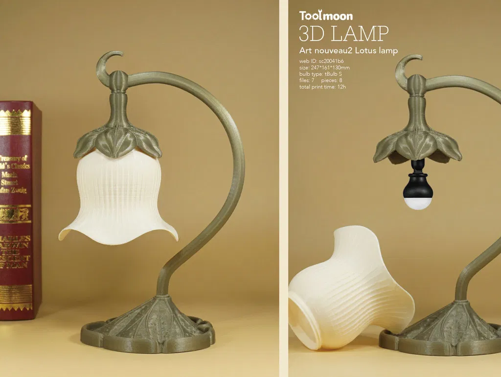 Mẫu đèn ngủ Art Nouveau Lotus lamp 2 với thiết kế tinh xảo. Tổng kích thước 247x161x130mm, gồm 8 mảnh ghép. Thời gian in khoảng 12 giờ, không cần support, phù hợp cho không gian trang trí nhà cửa thêm phần ấm cúng và sang trọng.