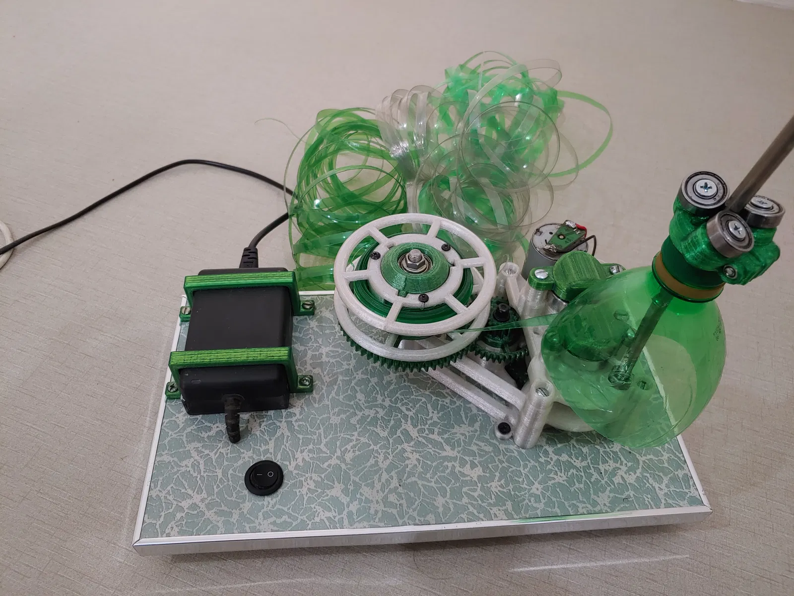 Cách sử dụng rất đơn giản: bạn chỉ cần gắn vỏ chai PET vào trục cố định, sau đó luồn mép nhựa vào khe cắt của máy. Khi bật công tắc, các bánh răng sẽ dẫn động để kéo dải nhựa ra một cách ổn định, đồng thời tạo ra những sợi dây nhựa có kích thước đồng nhất. Đây là giải pháp cực kỳ kinh tế và thân thiện với môi trường, giúp giảm lượng rác thải nhựa ra ngoài tự nhiên mà vẫn giữ được giá trị sử dụng cao cho những sản phẩm in 3D của bạn. Với thiết kế này, việc quản lý tốc độ và độ dày của dải nhựa trở nên dễ dàng hơn so với việc cắt thủ công bằng tay.