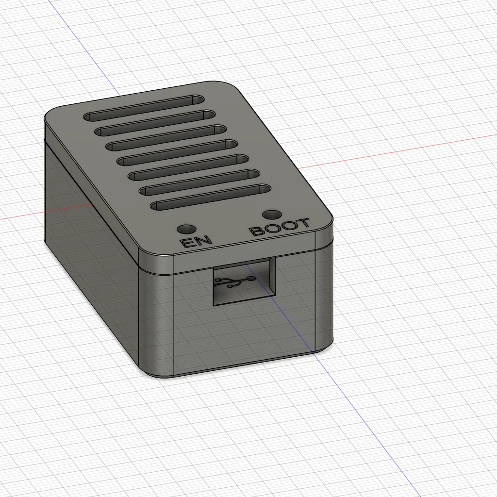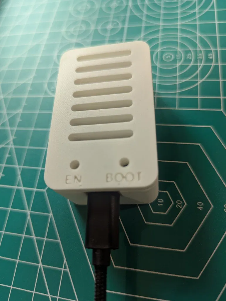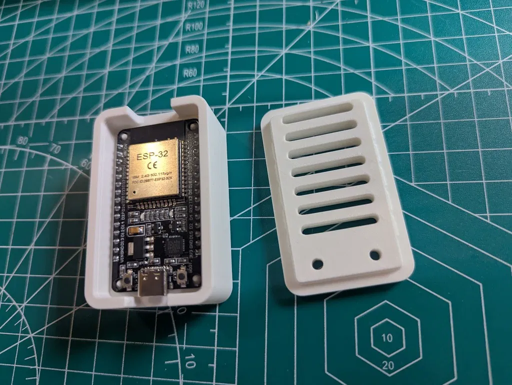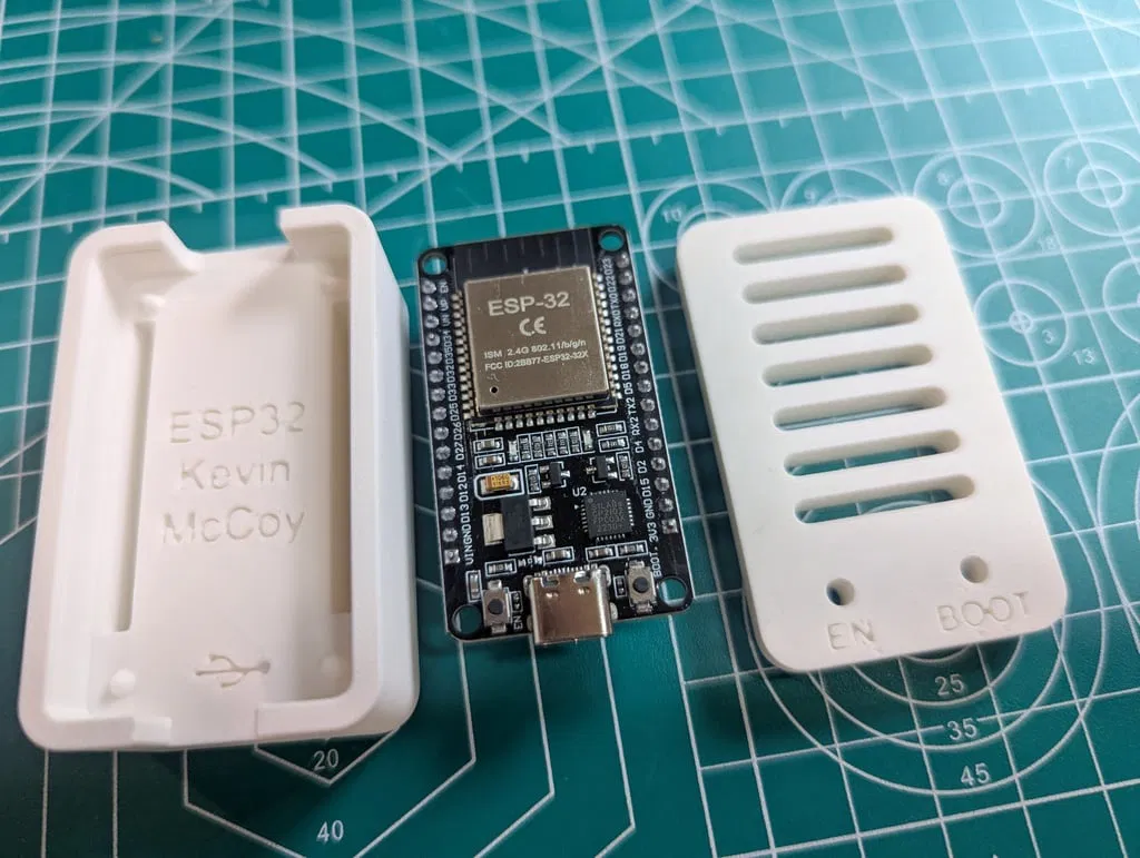 Vỏ hộp thiết kế dạng snap-fit cho ESP32 devkit 30 chân sử dụng cổng USB-C, đặc biệt dành cho phiên bản này từ Amazon US nhưng chắc cũng sẽ vừa với các loại khác. Ở bản in của mình, mình có in dập nổi tên cá nhân ở mặt trong và nhãn mô tả nhiều màu ở mặt ngoài, nhưng mình đã xóa bỏ các chi tiết đó trước khi đăng tải bản này. Model vẫn bao gồm chữ dập nổi ("esp32") và chỉ báo USB ở mặt trong, cùng chữ "EN" và "BOOT" trên bề mặt trên gần các lỗ để thao tác nút bấm. Nếu bạn muốn bản không có chữ thì mình cũng có đăng một phiên bản "No text". Ảnh chụp là bản in từ máy A1 mini của mình bằng nhựa Bambu PLA Matte White, thông số 15% infill và 2 vách (walls).