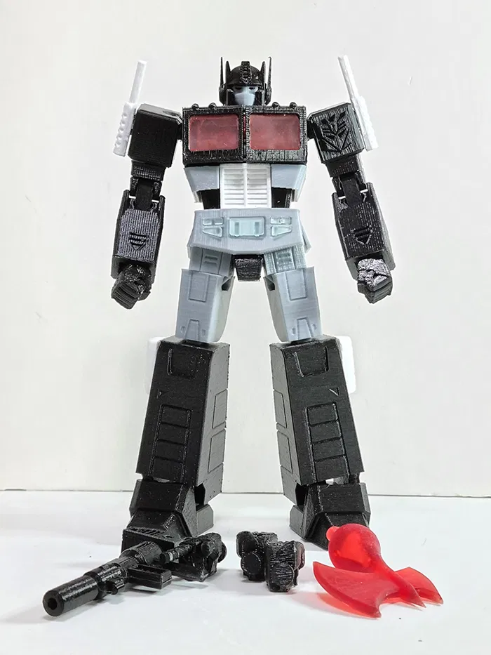 V2: Bản gốc được giữ lại ở đây để lưu trữ. Đây là bản remix từ mẫu G1 Optimus của Toymakr3D để trông giống TF: Devastation Optimus hơn (đã được sự cho phép). Phần lớn các file đã được cập nhật. Link gốc: https://www.thingiverse.com/thing:4138701 https://www.instagram.com/toymakr3d/ CÁC FILE GỐC KHÔNG ĐƯỢC BAO GỒM! Bạn có thể tìm thấy chúng ở nguồn gốc. Tuy nhiên, vì có rất ít chi tiết không thay đổi, có lẽ bạn nên in tất cả các file đã chỉnh sửa trước, sau đó mới tìm kiếm những gì còn thiếu từ mẫu gốc. Việc liệt kê từng file đã thay đổi sẽ tốn quá nhiều thời gian, thêm vào đó cách tổ chức file của mình cũng khá lộn xộn. Mình đã in ở tỷ lệ 85% trên máy E3 khá cũ và có kết quả ổn, nên chắc chắn vẫn còn nhiều chỗ để cải thiện. Hãy nhớ in các chi tiết có gắn nhãn TPU bằng chất liệu TPU để các khớp nối được bền hơn. IG của mình để xem thêm: https://www.instagram.com/plasticbruv/