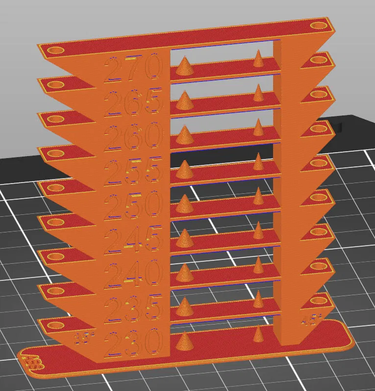 • Kiểm tra chi tiết: Tích hợp sẵn các chi tiết hình nón và các góc nghiêng (35 độ, 45 độ) giúp đánh giá khả năng in không hỗ trợ (overhang) và độ chi tiết của máy.