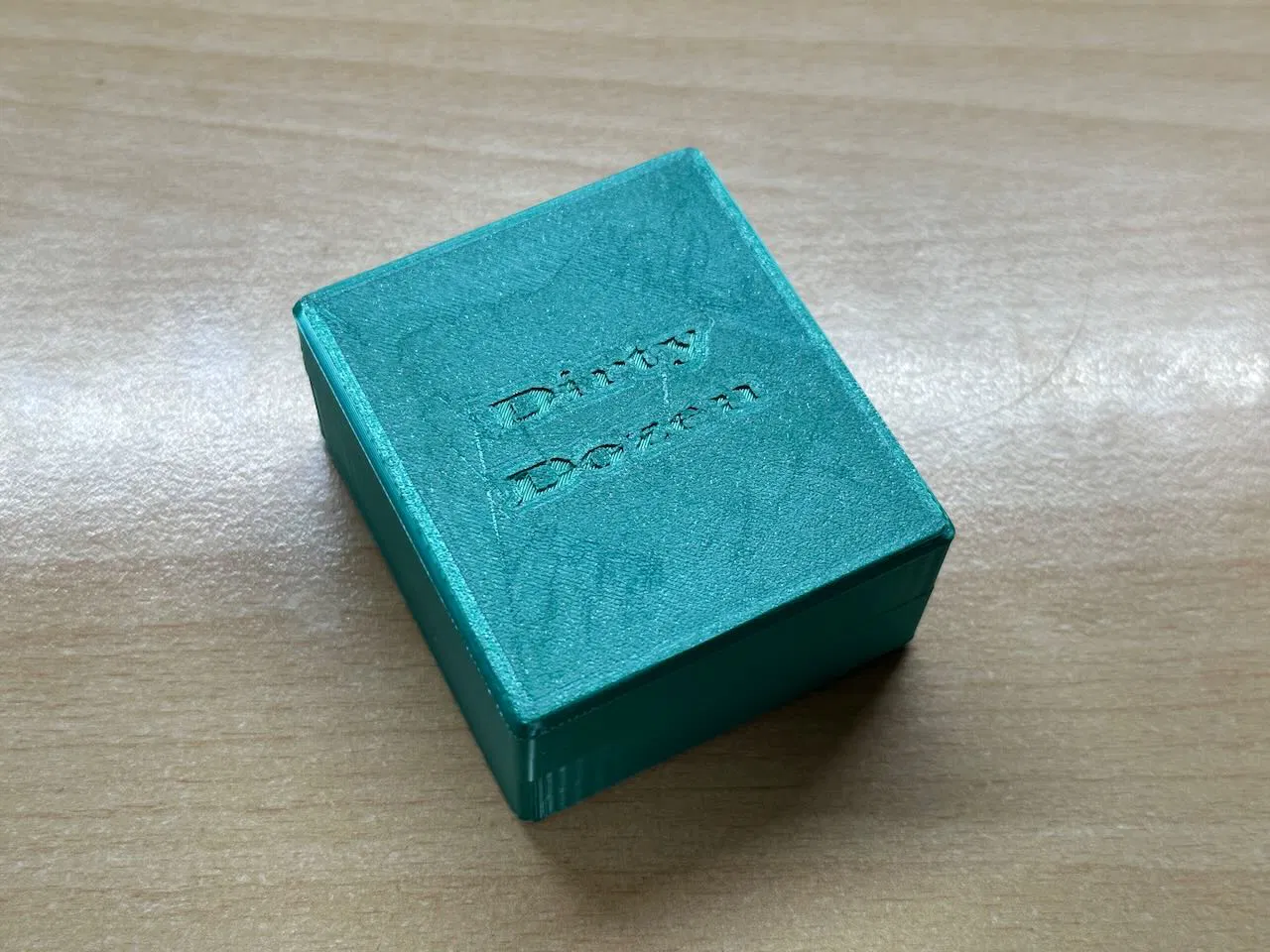 Phần nắp hộp được in nổi dòng chữ "Dirty Dozen", tạo điểm nhấn thẩm mỹ rất riêng biệt. Cấu trúc hộp gồm hai phần, thân dưới được chia không gian rộng rãi để xếp các mảnh ghép theo chiều dọc, giúp tiết kiệm diện tích và tạo sự khoa học khi lấy ra hoặc cất vào. Chất liệu in 3D không chỉ bền bỉ mà còn cho phép bạn tùy chỉnh màu sắc theo ý thích cá nhân, như trong hình là sự kết hợp giữa màu xanh ngọc bích của hộp và các mảnh ghép màu tím chuyển sắc (dual color) rất bắt mắt.