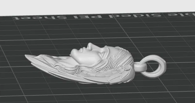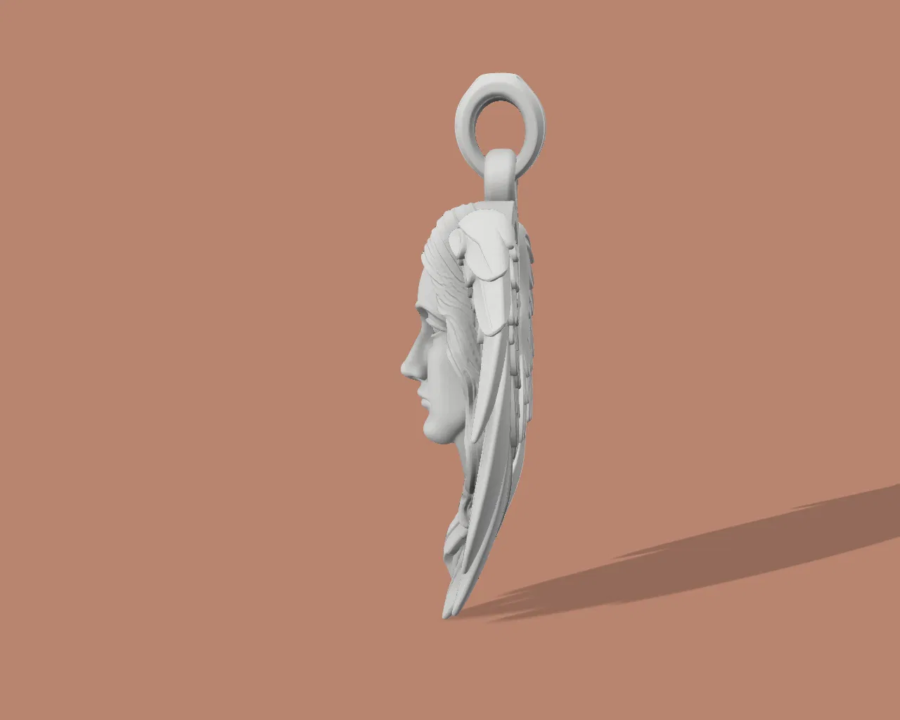 Mẫu mặt dây chuyền thiên thần (Angel Pendant) đầy tinh xảo này khắc họa một gương mặt điềm tĩnh, thanh tú, xung quanh là mái tóc bồng bềnh cùng đôi cánh lông vũ uy nghi. Đây là phụ kiện mang ý nghĩa biểu tượng, bạn có thể dùng làm trang sức, vật phẩm trưng bày hoặc móc khóa độc đáo. Phía sau được khoét rỗng để tiết kiệm vật liệu và giảm trọng lượng nhưng vẫn đảm bảo độ bền chắc.