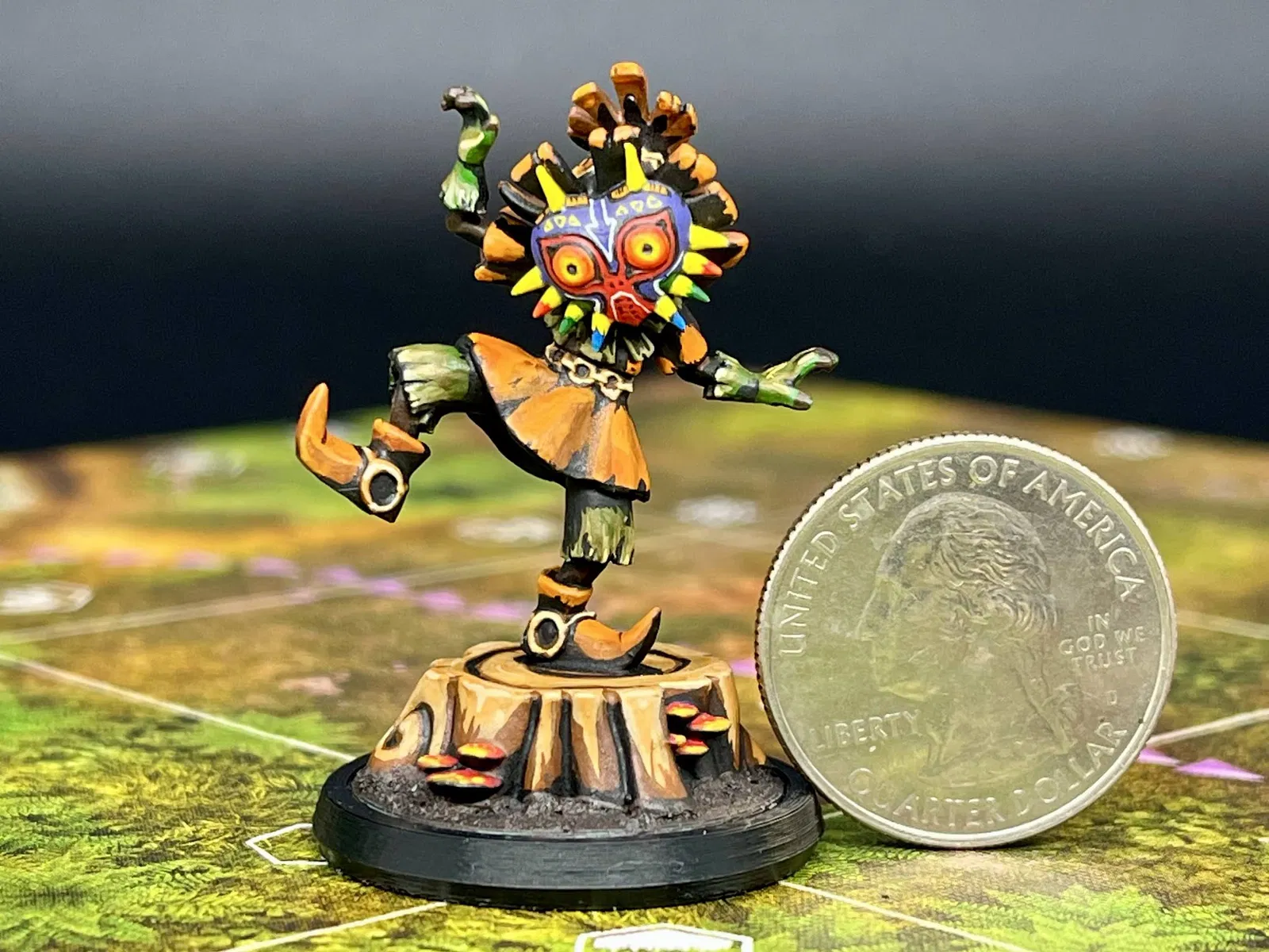 Nếu bạn là một người hâm mộ cuồng nhiệt của series game huyền thoại Zelda, chắc chắn bạn không thể bỏ qua mô hình Skull Kid đeo mặt nạ Majora này. Đây là một phiên bản mô hình tí hon (miniature) được thiết kế tỉ mỉ với tỷ lệ 38mm, rất phù hợp để làm điểm nhấn trên bàn chơi cờ bàn (tabletop) hoặc để bổ sung vào bộ sưu tập mô hình game của bạn. Nhân vật được khắc họa ở tư thế năng động, đứng trên một gốc cây có điểm xuyết các chi tiết nấm nhỏ, tạo nên một bối cảnh đậm chất rừng rậm bí ẩn.