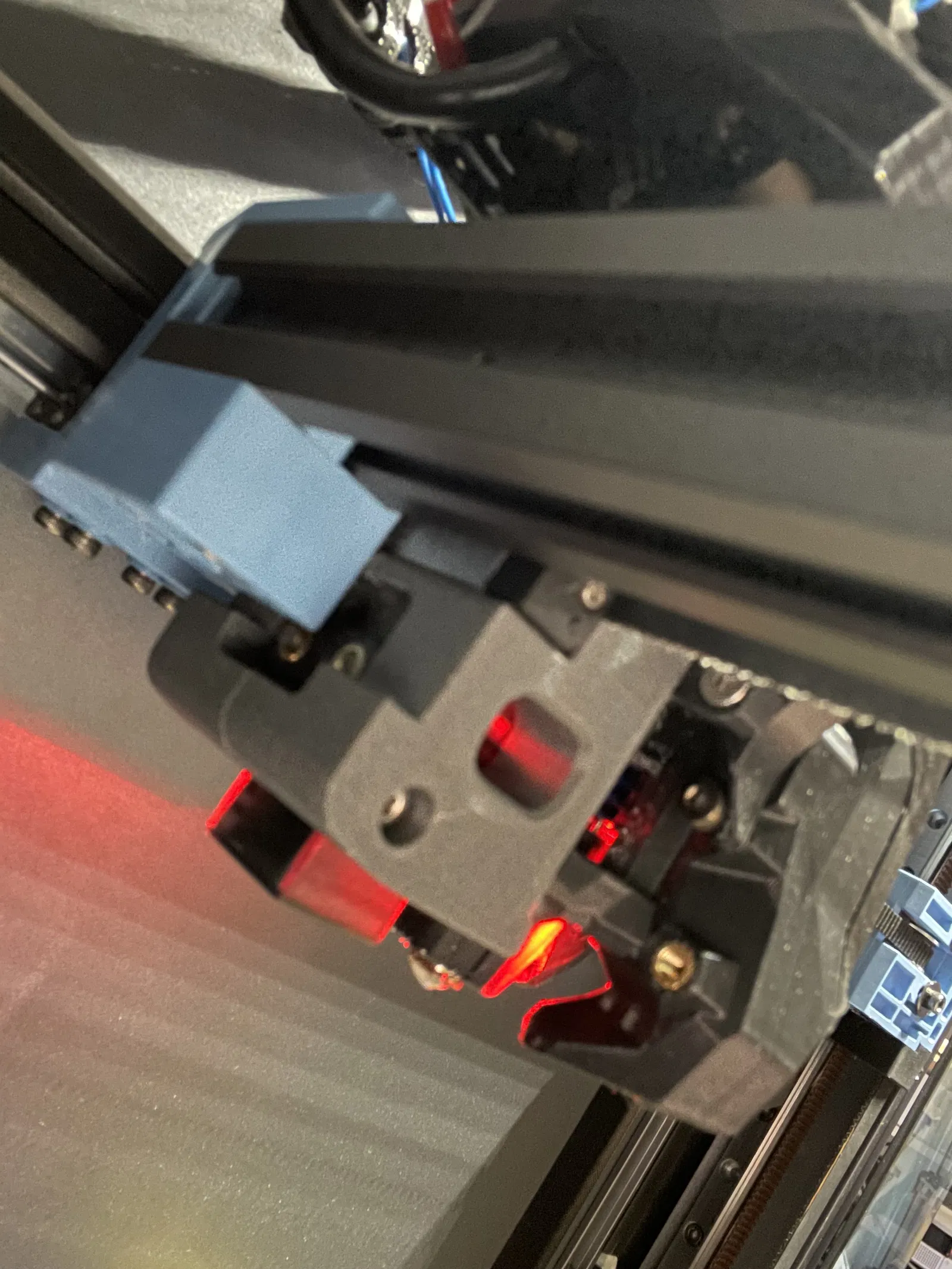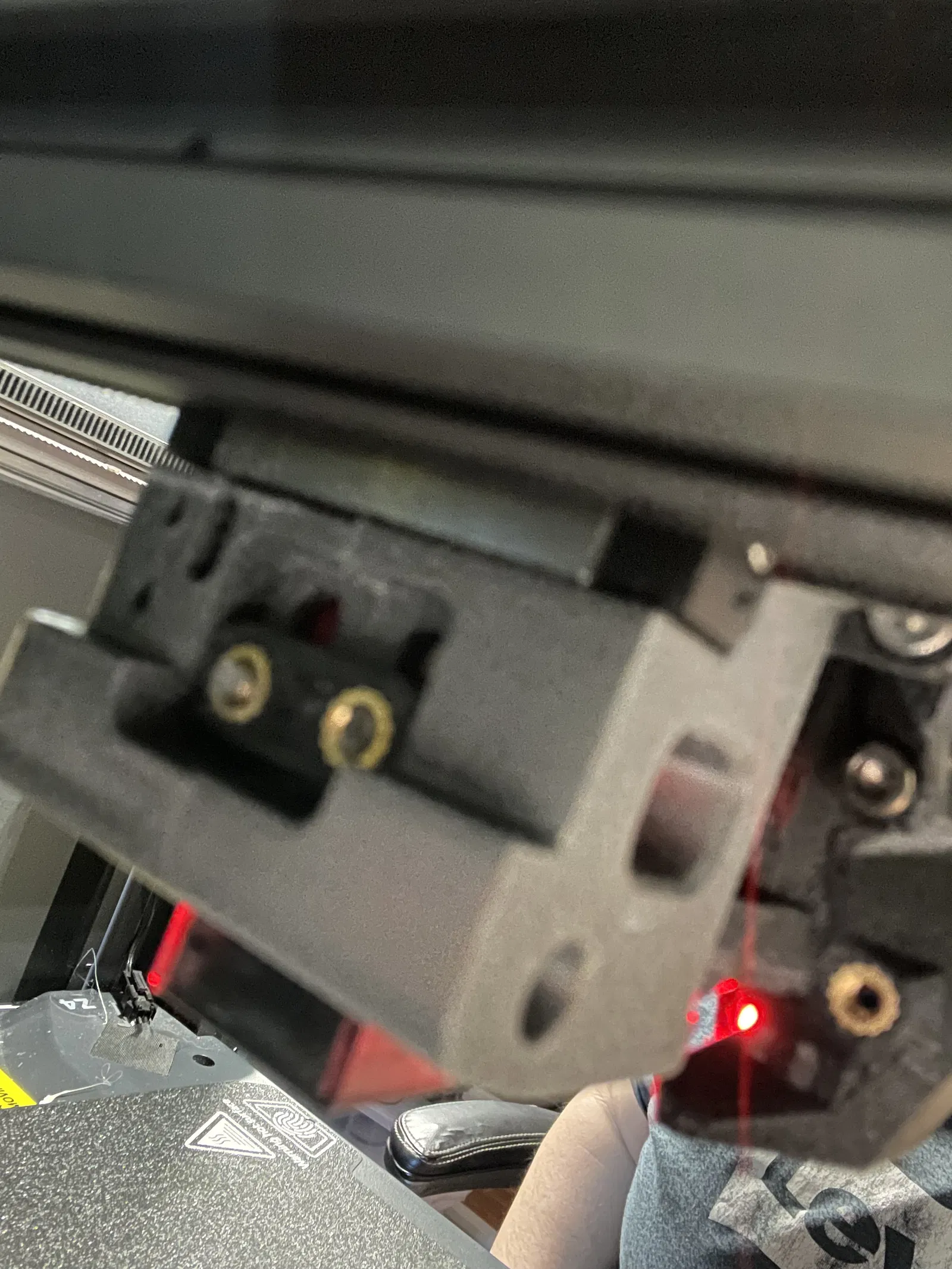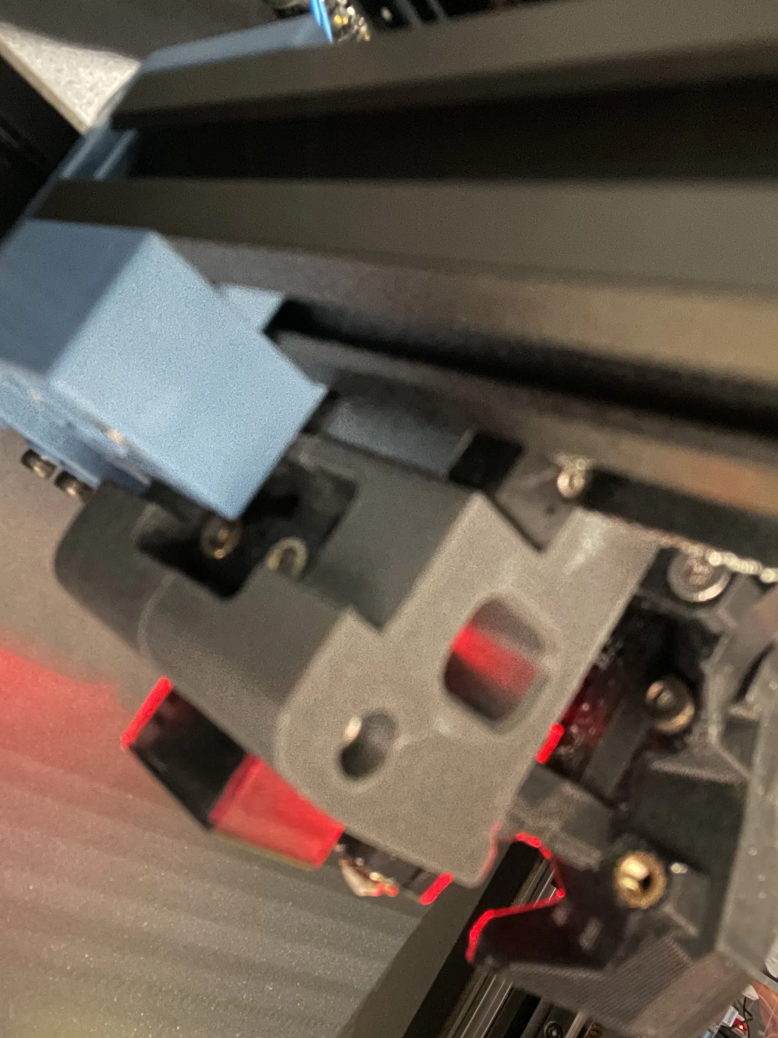 Lưu ý: Nếu bạn đang sử dụng cảm biến bed probe được gắn trên carriage với bracket giữ probe, hãy đảm bảo các ốc M3 không bị nhô ra phía sau quá nhiều, nếu không chúng cũng sẽ va chạm với cụm xy carriage khi homing. Mình đã đánh dấu phần nhô ra 1mm và dùng máy Dremel để cắt ngắn ốc M3 lại.