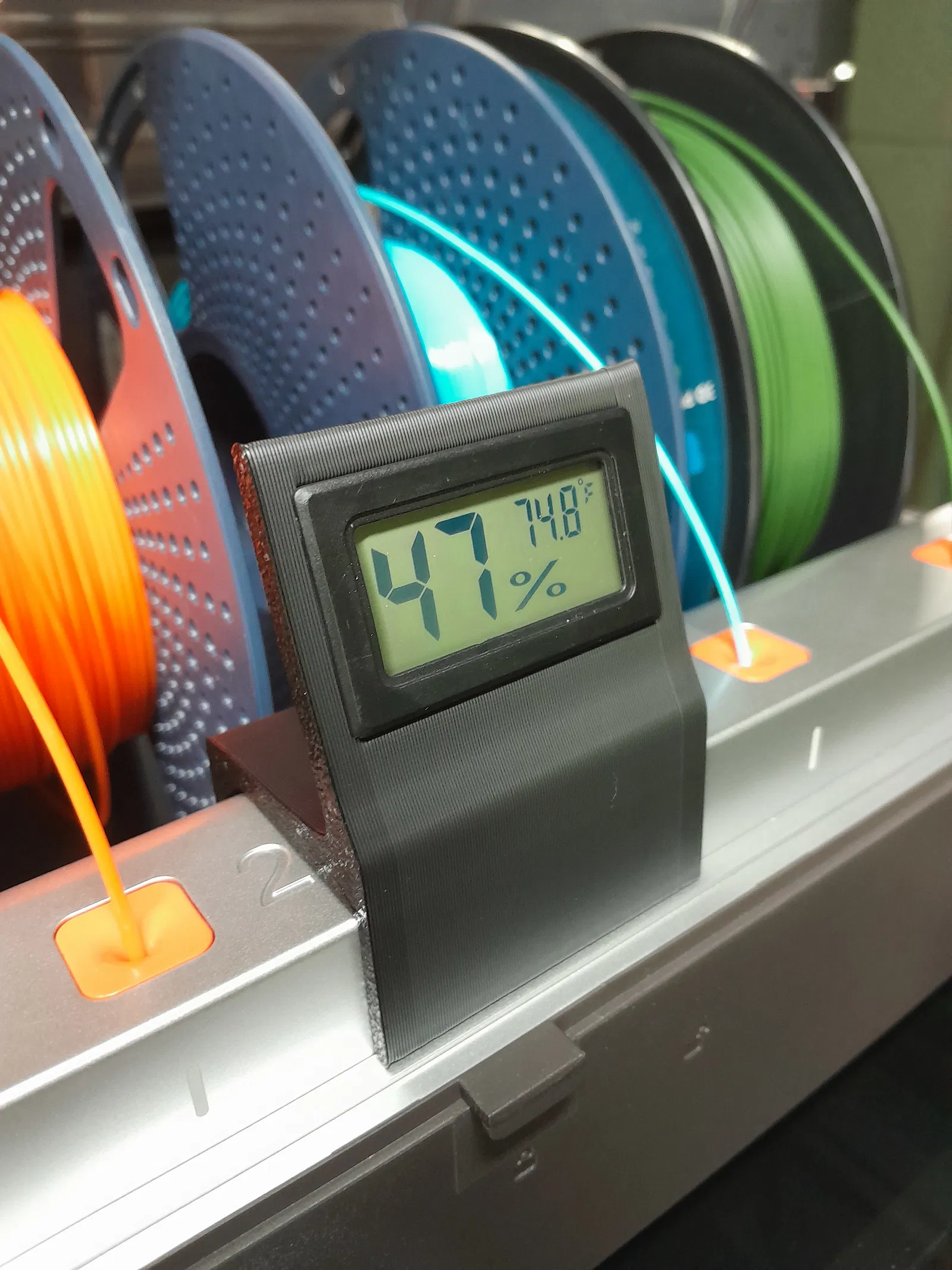 Việc theo dõi chính xác độ ẩm trong khu vực đặt sợi nhựa sẽ giúp bạn quyết định xem có cần sấy lại nhựa trước khi in hay không, từ đó tránh được các lỗi thường gặp như tắc nghẽn đầu phun hoặc bề mặt in bị nổ, sần sùi. Các bạn có thể in mẫu này với nhiều loại nhựa phổ biến hiện nay như PLA hoặc PETG để đảm bảo độ bền và tính thẩm mỹ.