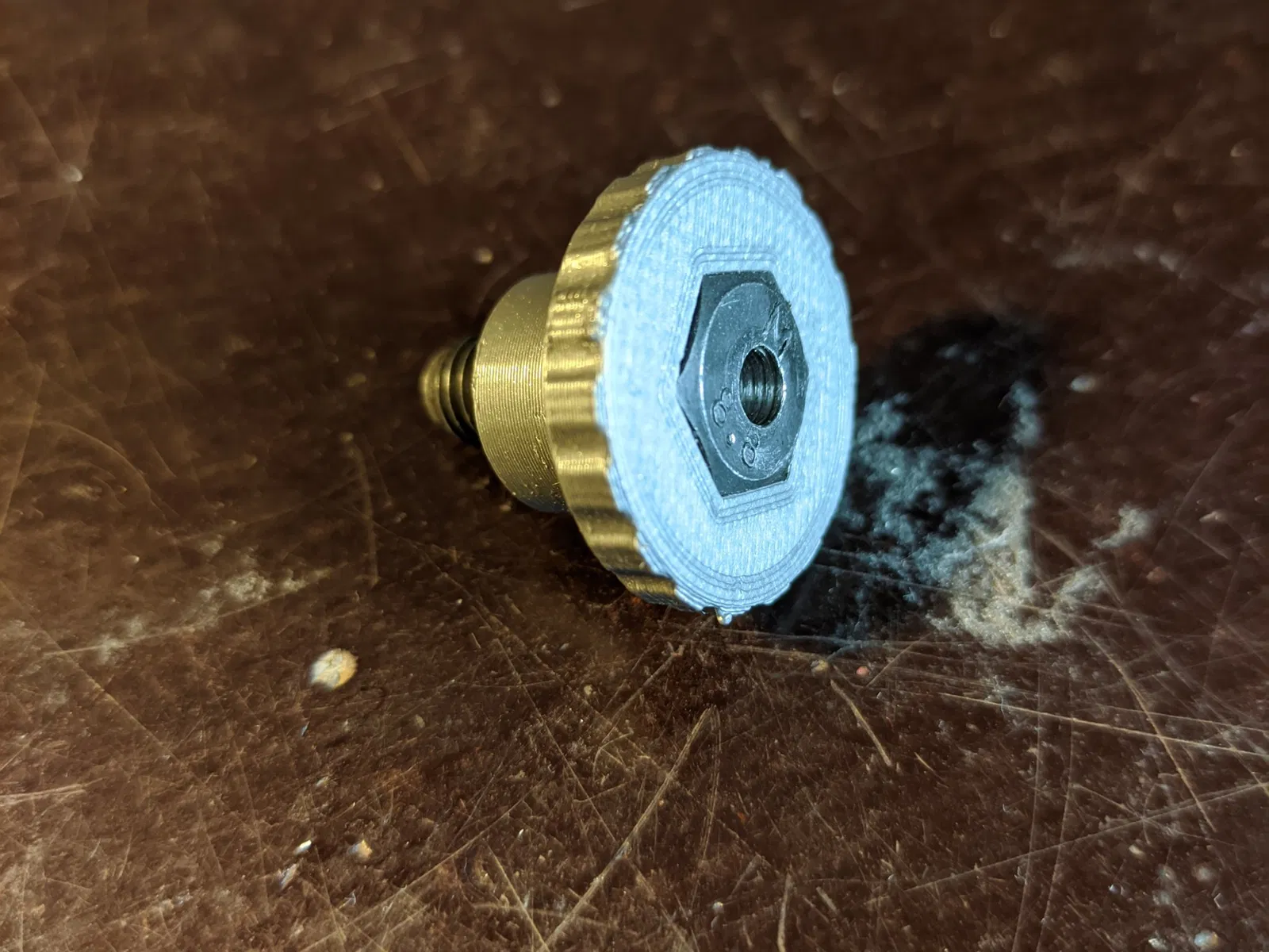 Chỉ là một núm có thể in được nơi bạn có thể chèn một núm đầu lục giác M8. In nó ngược lại. Nó có một lớp hy sinh cho lỗ.