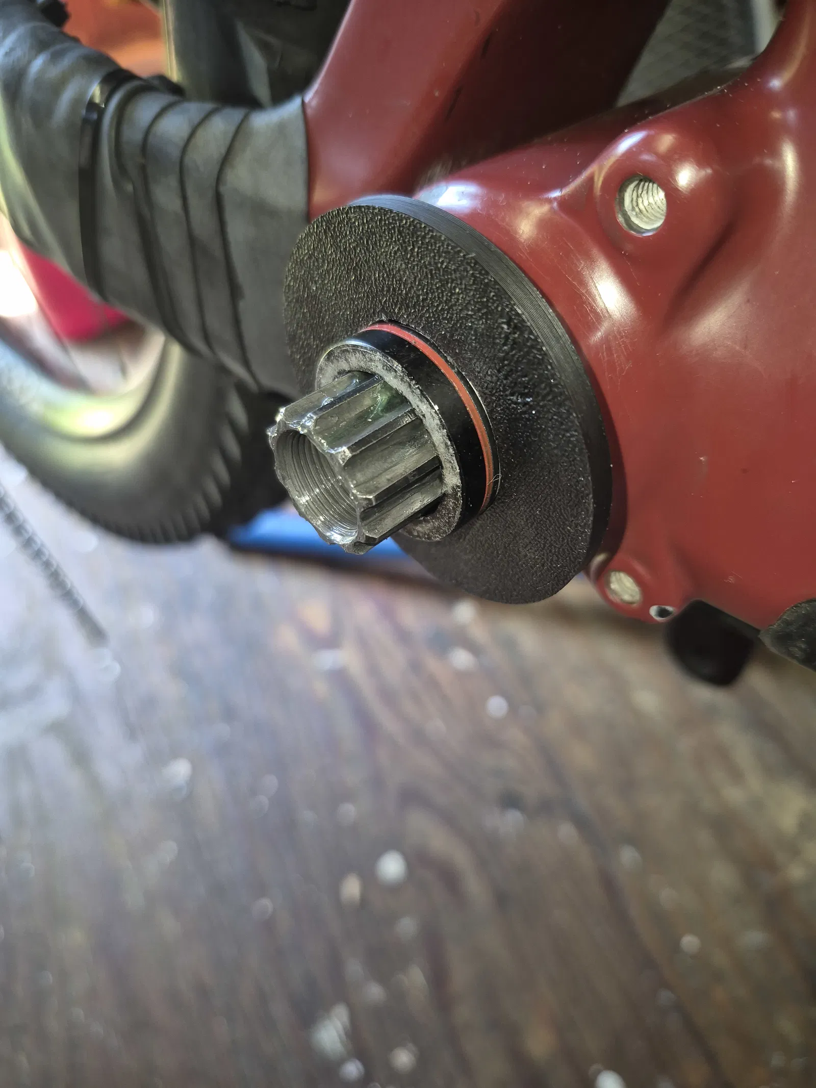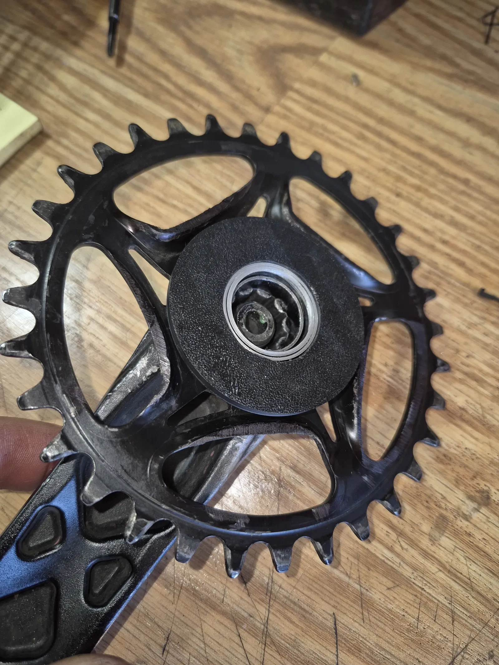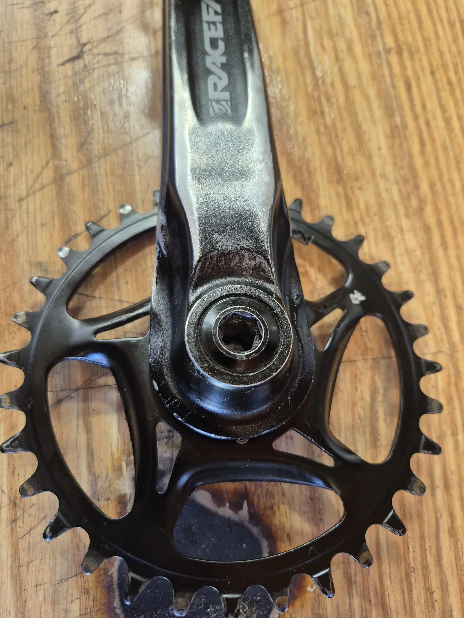 Để lắp vào xe, bạn cần tháo giò dĩa bên phải ra. Đặt miếng đĩa có cạnh gờ hướng về phía trục giữa lên trên các vòng đệm (spacers) rồi lắp giò dĩa lại. Nhớ siết đúng lực theo thông số của Raceface (khoảng 56Nm) trước khi chạy nhé!