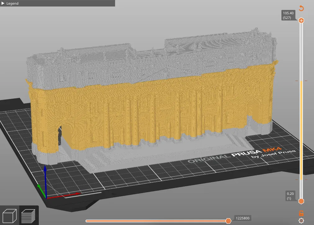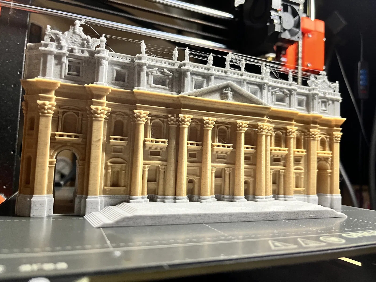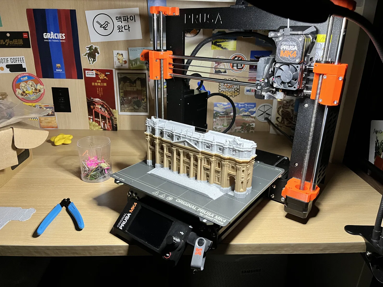 Ảnh in màu xám chính thực hiện bởi @stereolab.kw với đầu phun 0.2mm. Ảnh in mặt tiền tỉ lệ 200% trên máy Prusa MK4 với nhựa Prusament PLA “marble grey” và Fillamentum PLA “mukha”. Lớp in 0.2mm, infill 15% kiểu lightning, không cần brim, không support & render bởi Dany Sánchez.