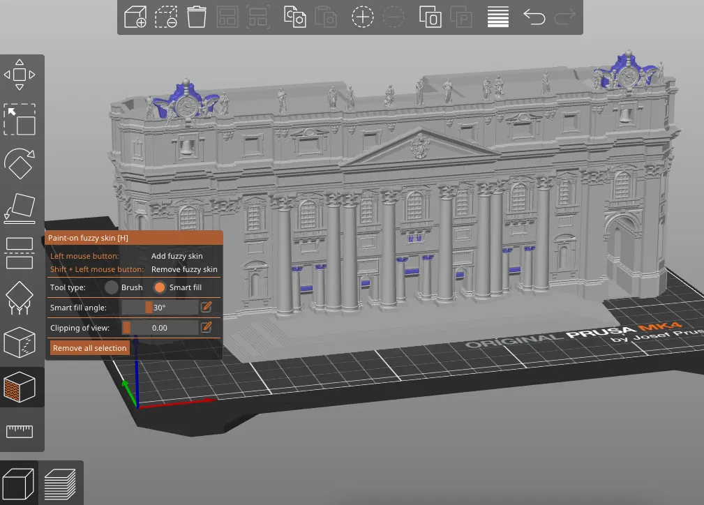 Sử dụng tính năng 'fuzzy skin' trong phần mềm cắt lớp (slicer) cho một số bề mặt để tăng cường chi tiết và mô phỏng kết cấu đá, xem thêm hình ảnh đính kèm.