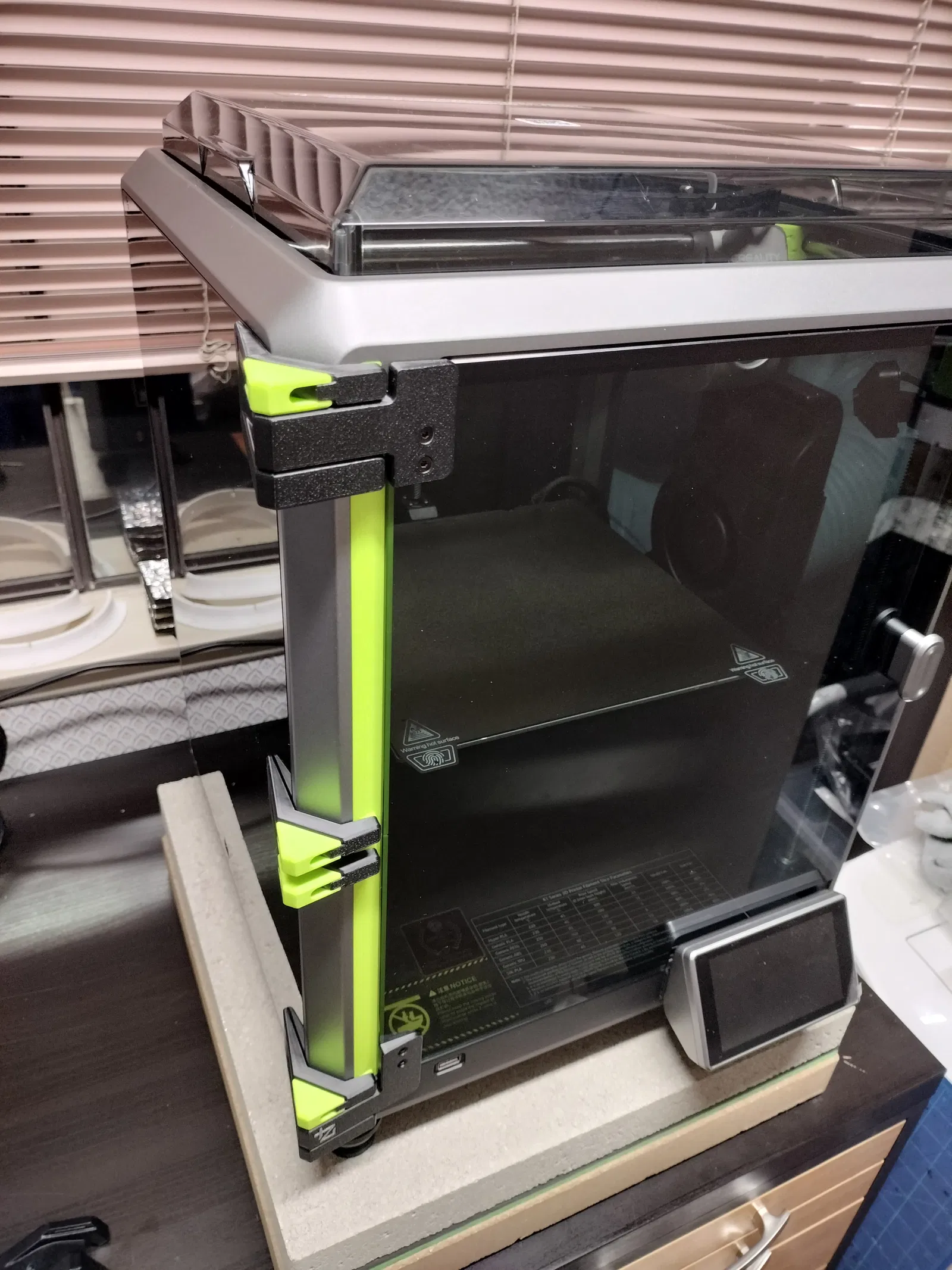 Mình đã thử nghiệm qua nhiều phiên bản của bộ bản lề này (in bằng nhựa ASA) trong hàng trăm giờ in, ngay cả khi in ở gia tốc cao và nhiệt độ buồng in lên tới 60°C, bản lề vẫn không hề bị biến dạng và cánh cửa luôn nằm ngay ngắn trên khung.